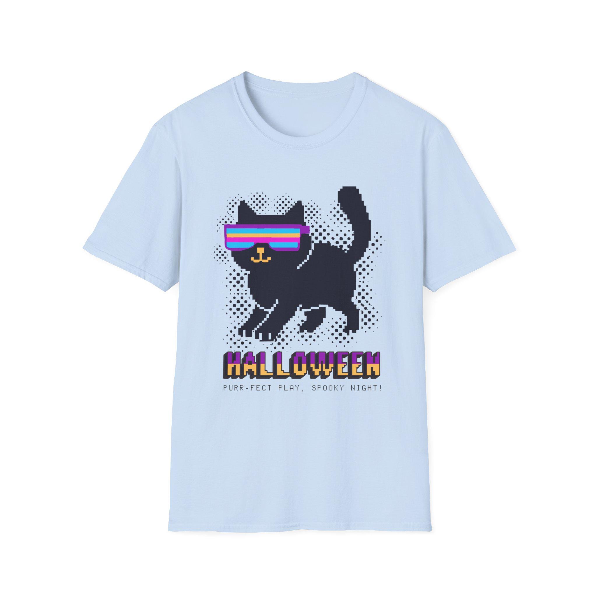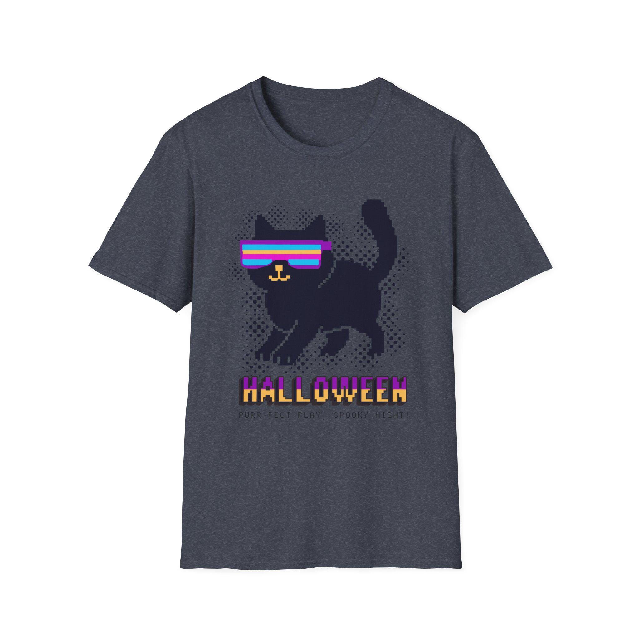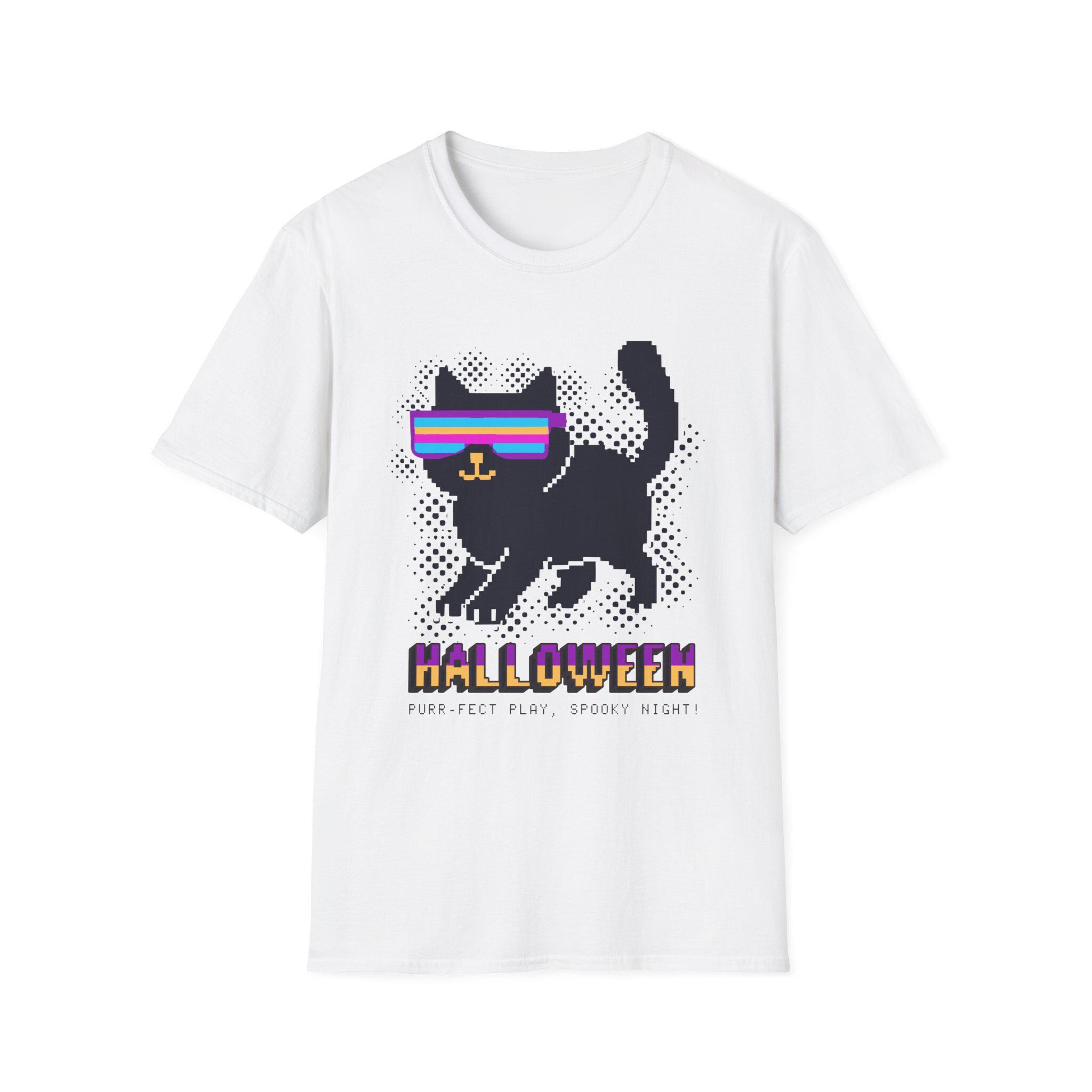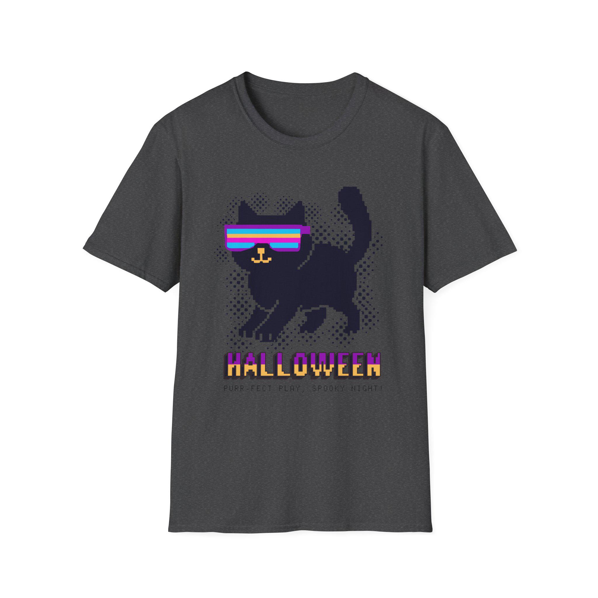 Designed in nostalgic 8-bit pixel art, this t-shirt design showcases a pixelated black cat donning striped retro sunglasses (pink, blue, and yellow) against a dotted background reminiscent of classic arcade games. At the bottom, HALLOWEEN appears in bold purple and gold pixel letters, with the playful tagline PURR-FECT PLAY, SPOOKY NIGHT! rendered in a classic arcade font. The overall vibe is bright, fun, and family-friendly—ideal for Halloween apparel, gifts for gamers and cat lovers, and retro-inspired wardrobe staples. This design translates well to tees and other apparel, offering a colorful, vintage gaming aesthetic without a scary tone.