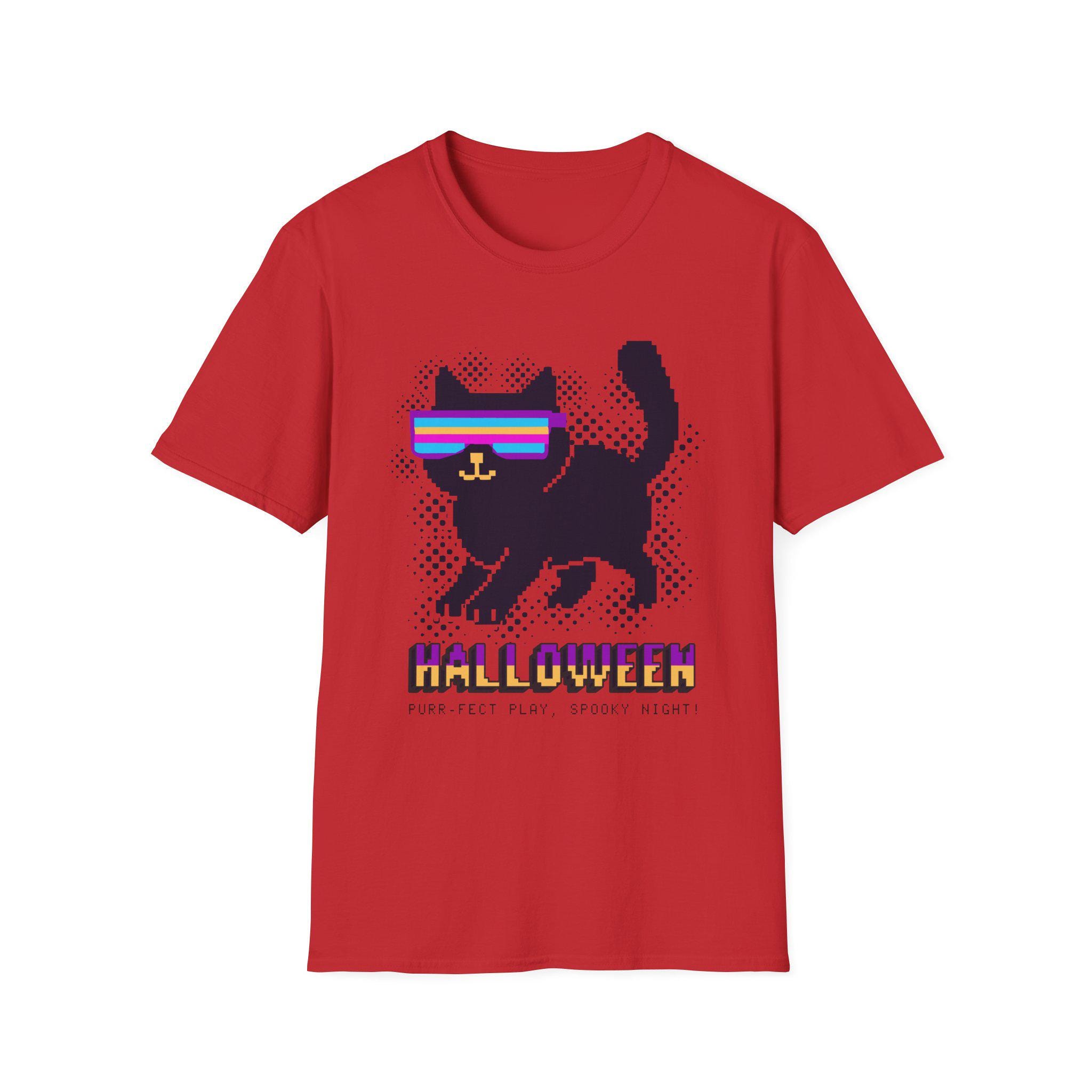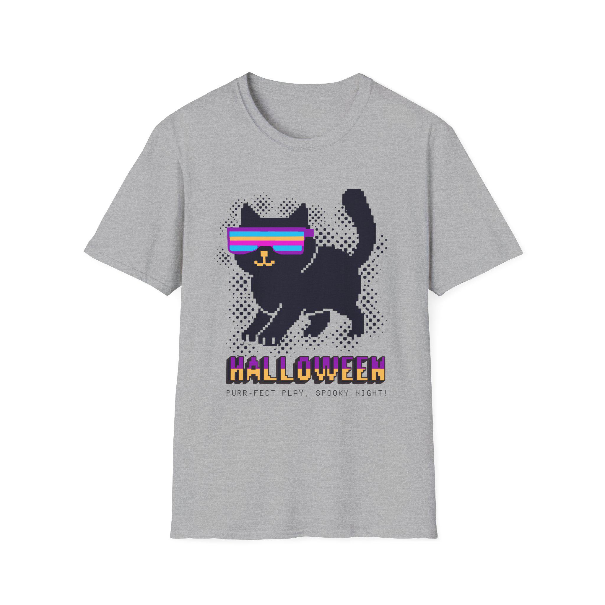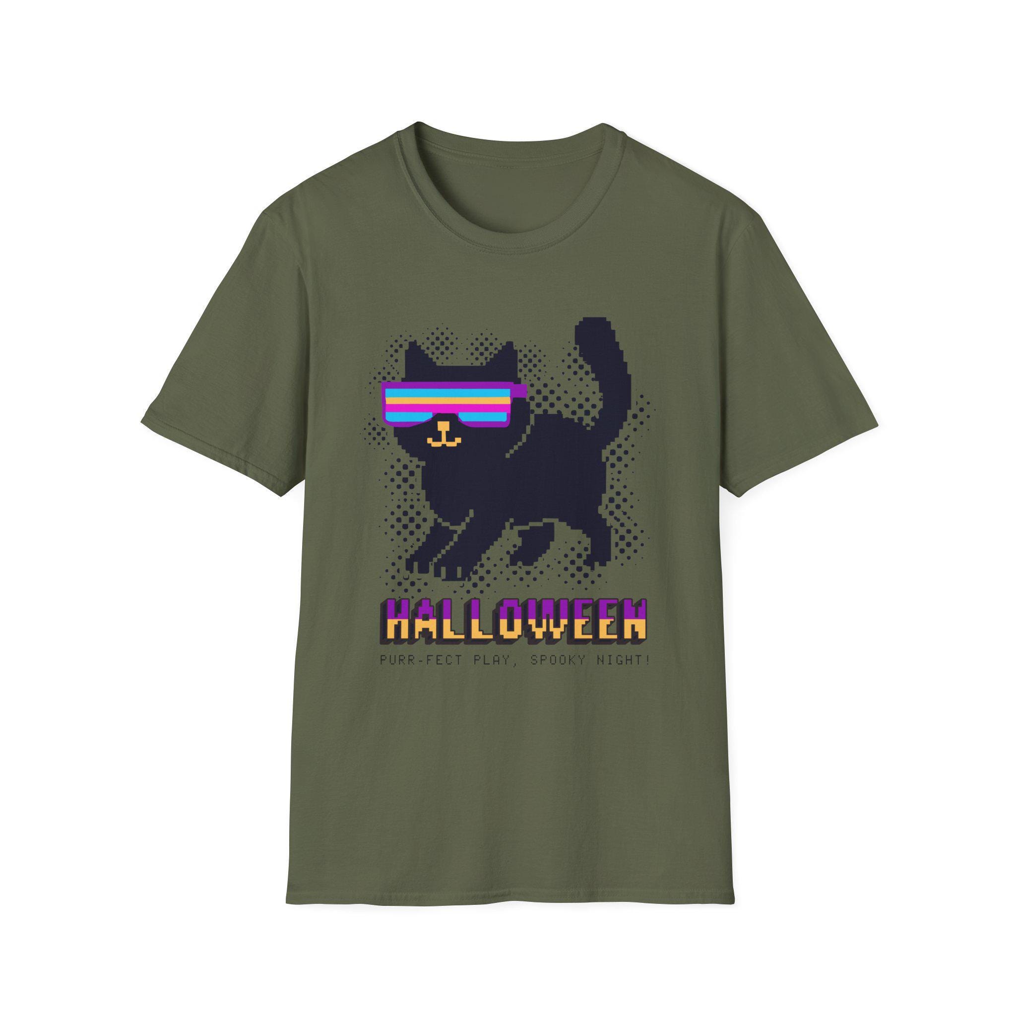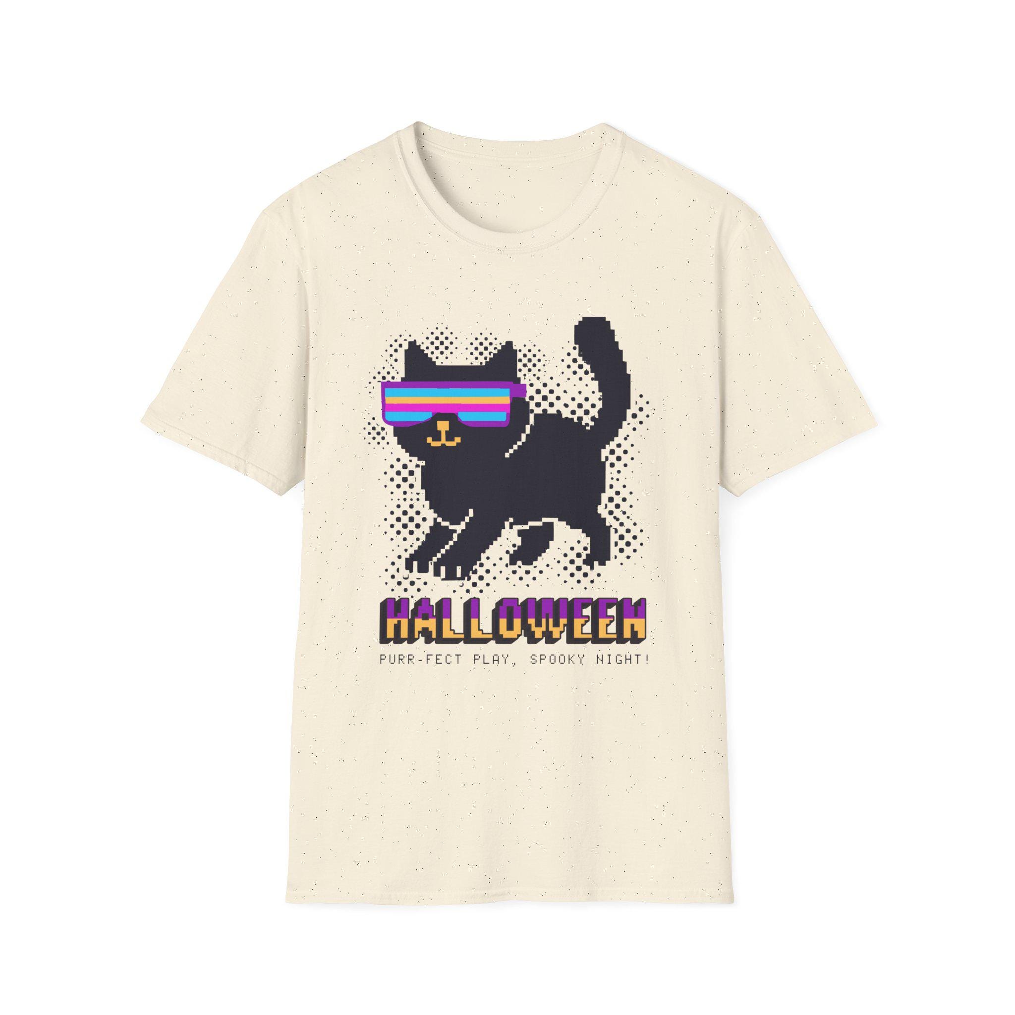 Designed in nostalgic 8-bit pixel art, this t-shirt design showcases a pixelated black cat donning striped retro sunglasses (pink, blue, and yellow) against a dotted background reminiscent of classic arcade games. At the bottom, HALLOWEEN appears in bold purple and gold pixel letters, with the playful tagline PURR-FECT PLAY, SPOOKY NIGHT! rendered in a classic arcade font. The overall vibe is bright, fun, and family-friendly—ideal for Halloween apparel, gifts for gamers and cat lovers, and retro-inspired wardrobe staples. This design translates well to tees and other apparel, offering a colorful, vintage gaming aesthetic without a scary tone.
