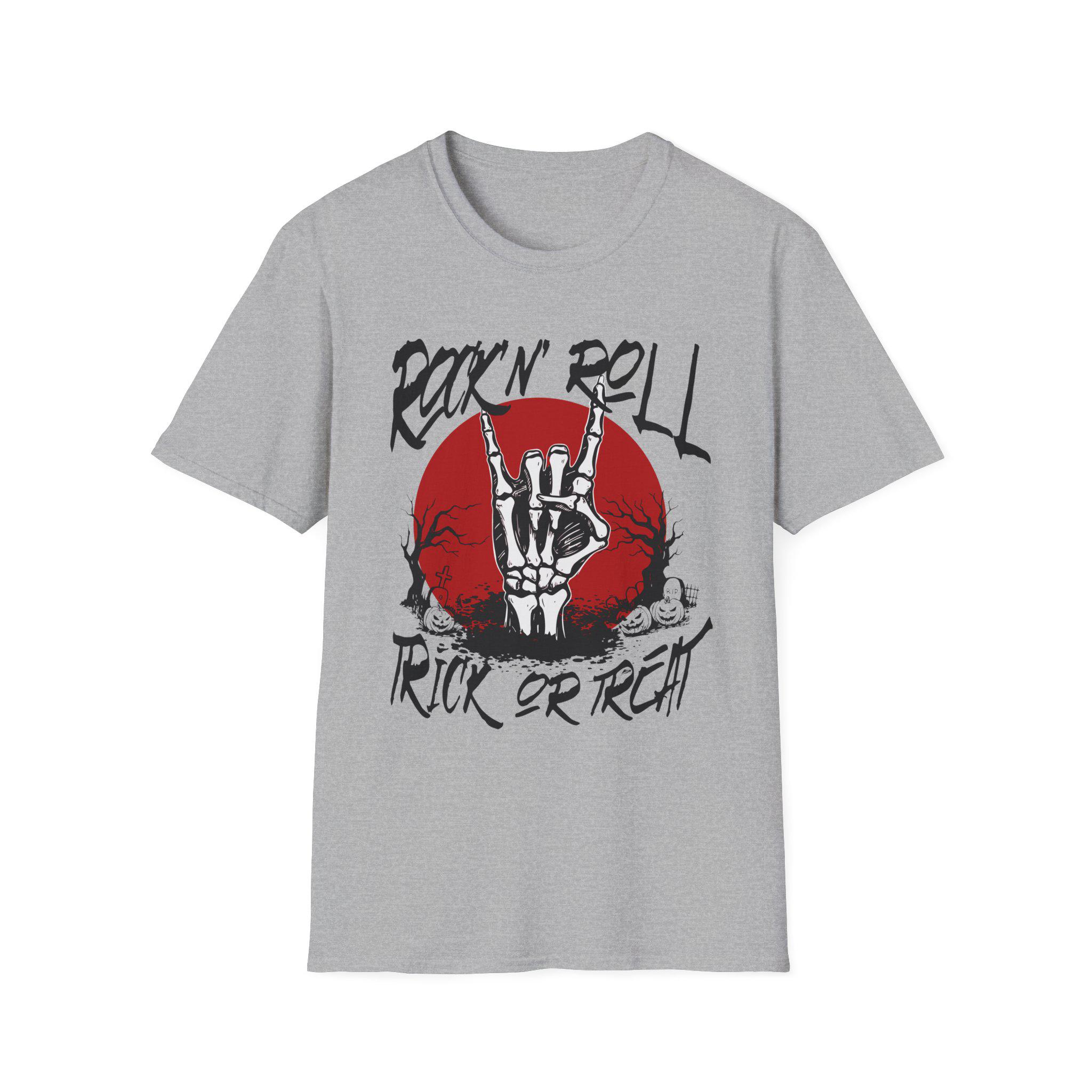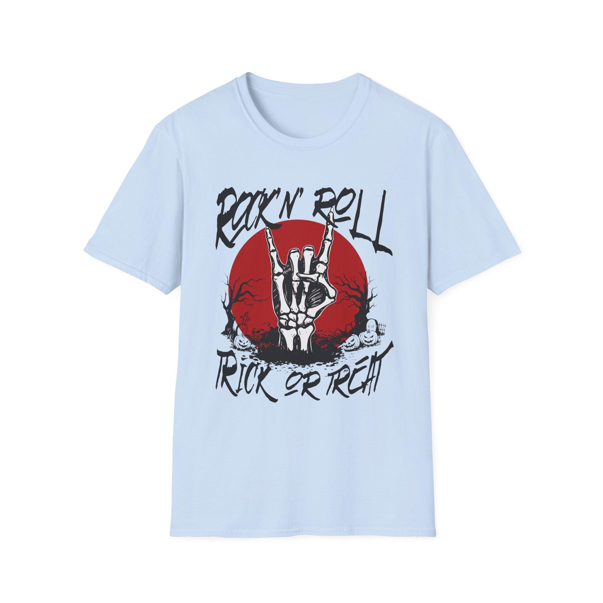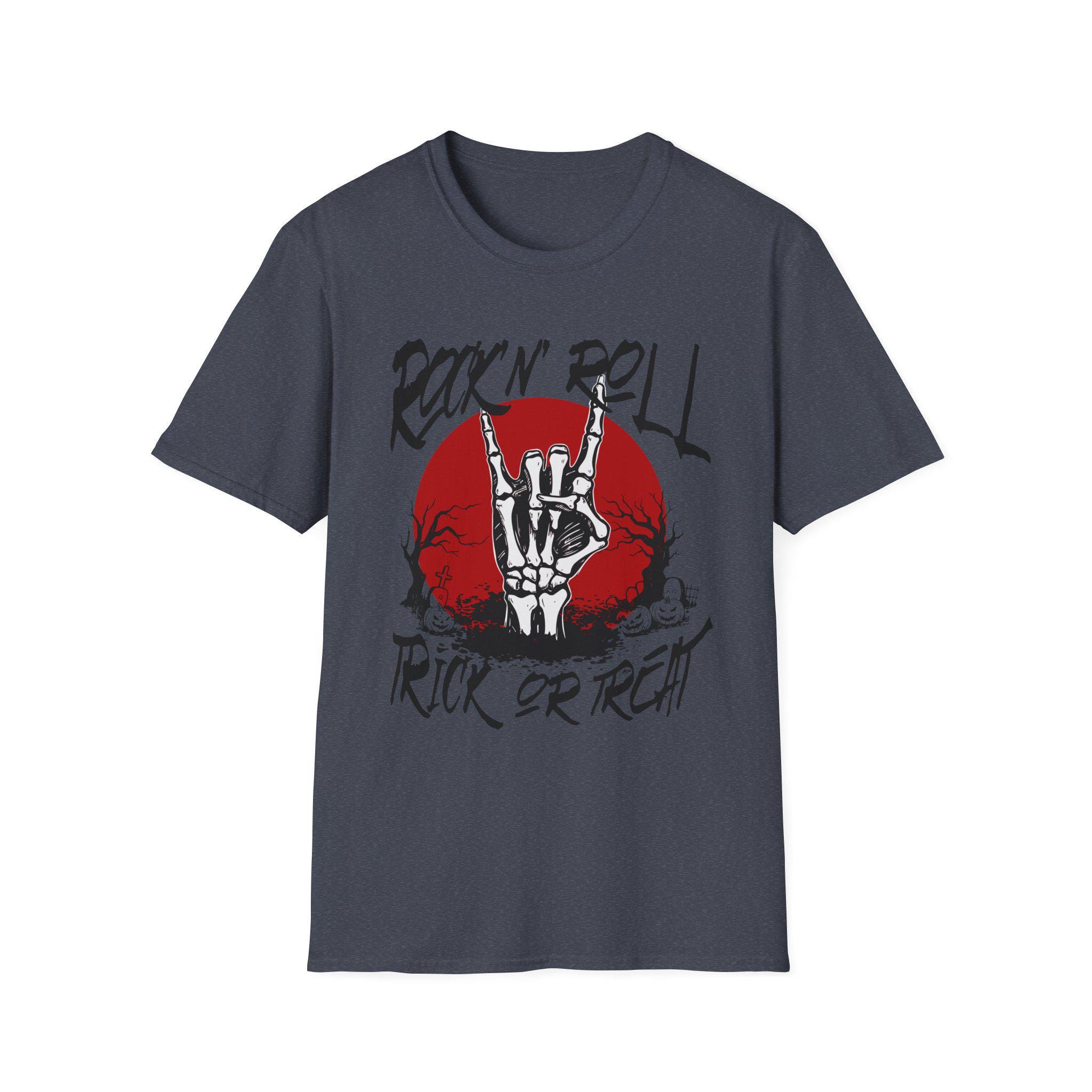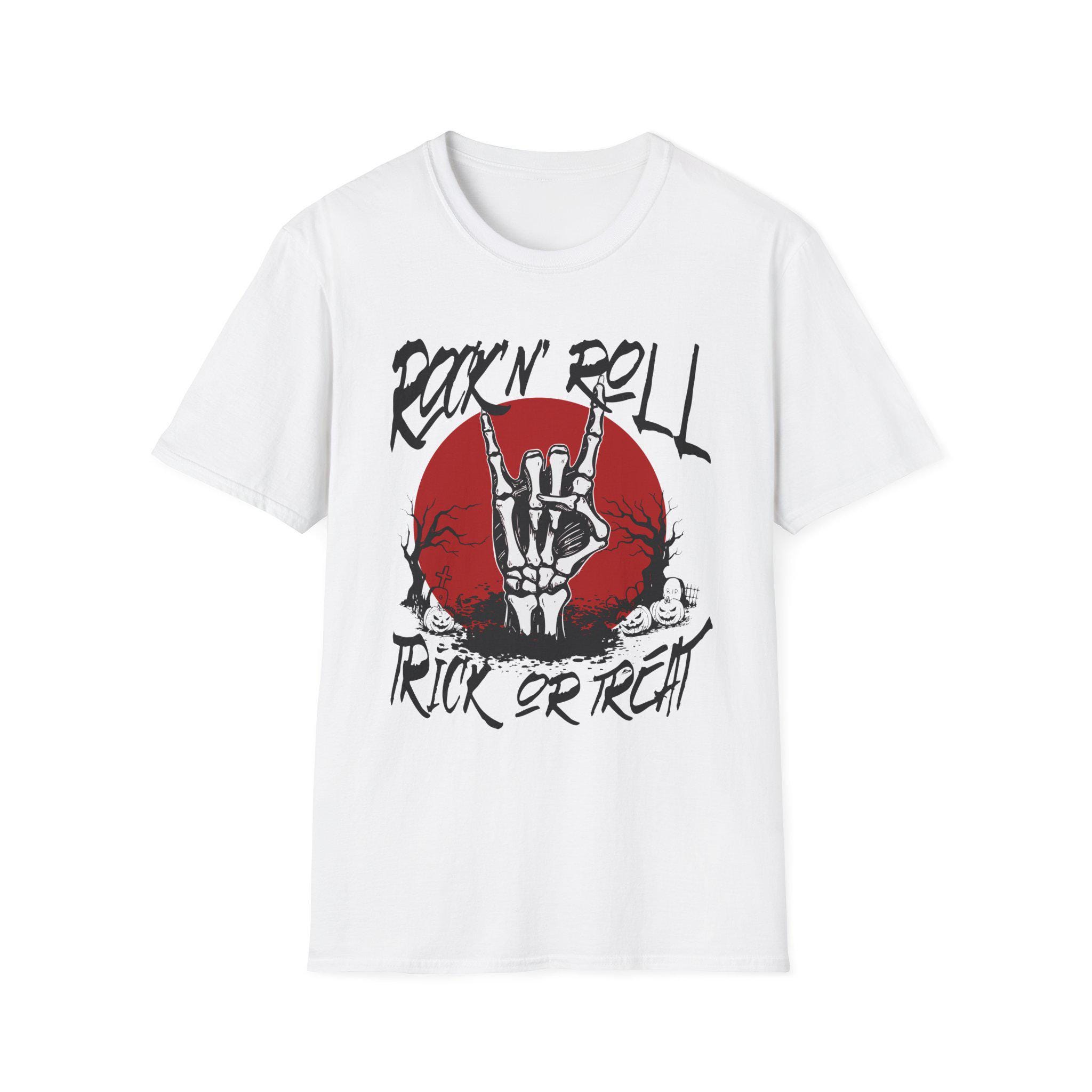 This front-print t-shirt fuses Halloween gothic mood with rock swagger. A skeletal hand rises from the ground, flashing the rock-on gesture as a blood-red moon looms in the background. Surrounding elements—carved pumpkins, bare twisted trees, a tombstone labeled RIP, and a cross grave marker—accent the dark, retro-punk poster vibe. In bold, high-contrast typography, “ROCK 'N' ROLL” crowns the top and “TRICK OR TREAT” finishes the bottom, delivering a classic Halloween rocker aesthetic. The design uses a black/white/red palette for maximum impact and prints cleanly on black or dark shirts. Perfect for Halloween gigs, concert merch, or spooky season apparel