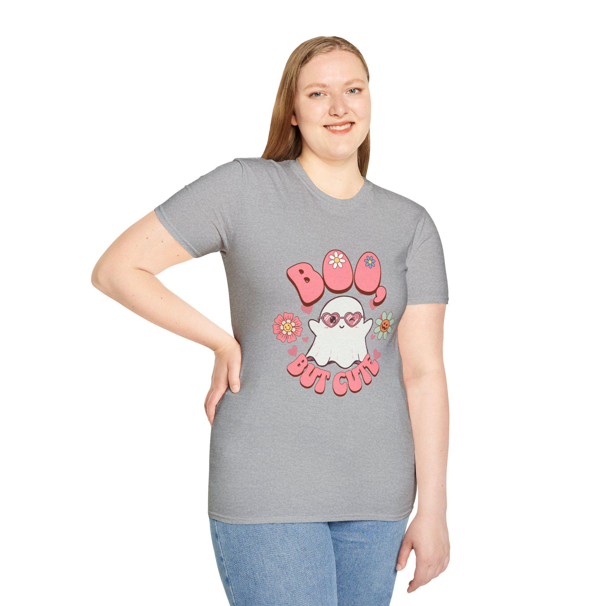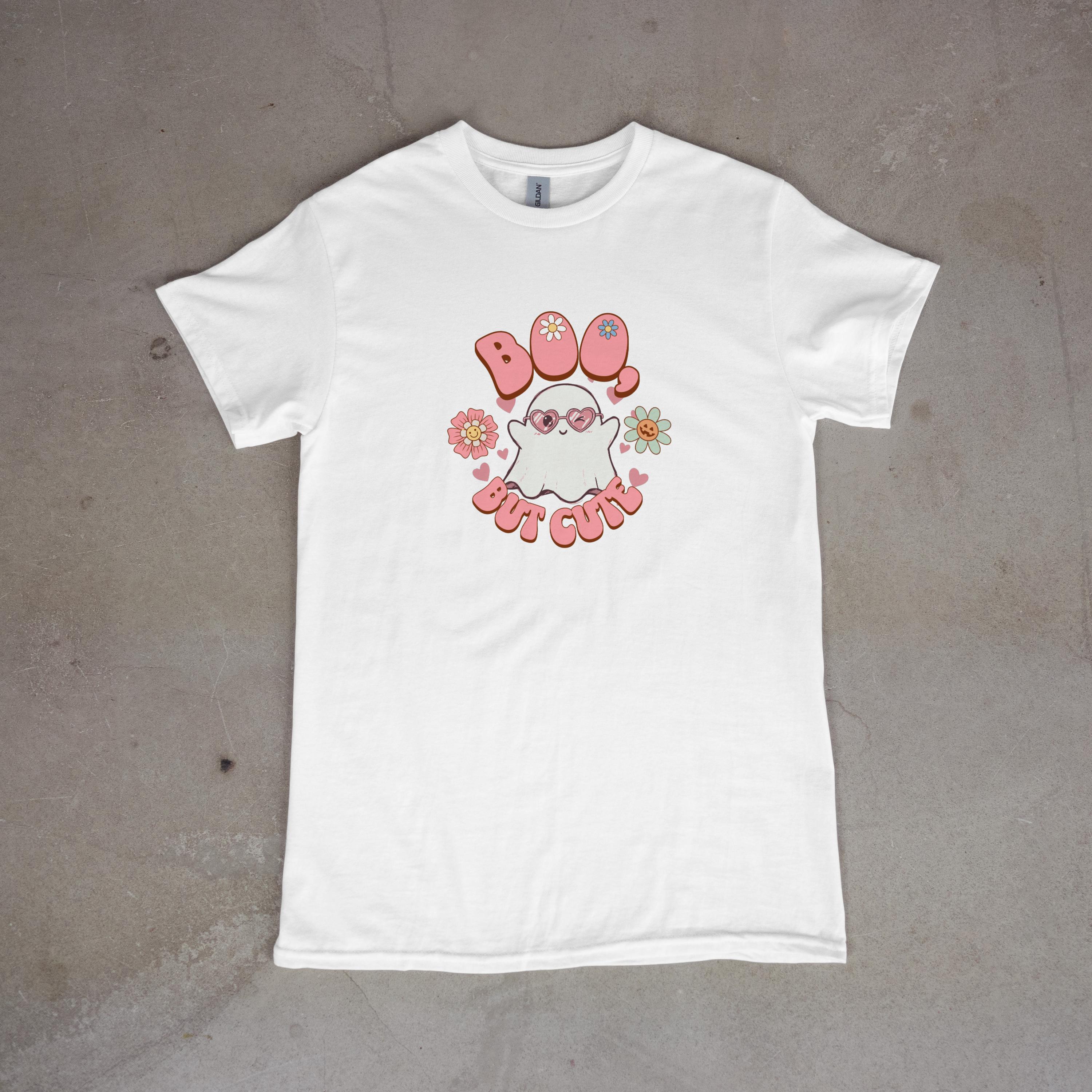 Meet the adorable kawaii Halloween tee: a white ghost wearing heart-shaped pink glasses, winking with a friendly smile. The design stacks “BOO” at the top and “BUT CUTE” at the bottom in pink bubble letters outlined in brown, each accented with tiny flowers. Pink hearts float around, with a pink flower featuring a smiling face on the left and a mint-green flower with a jack-o'-lantern face on the right.