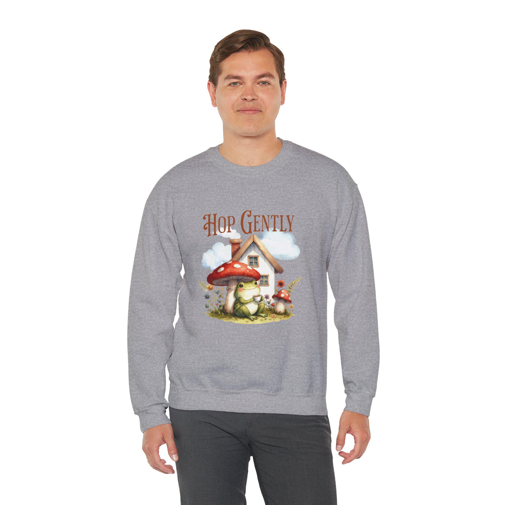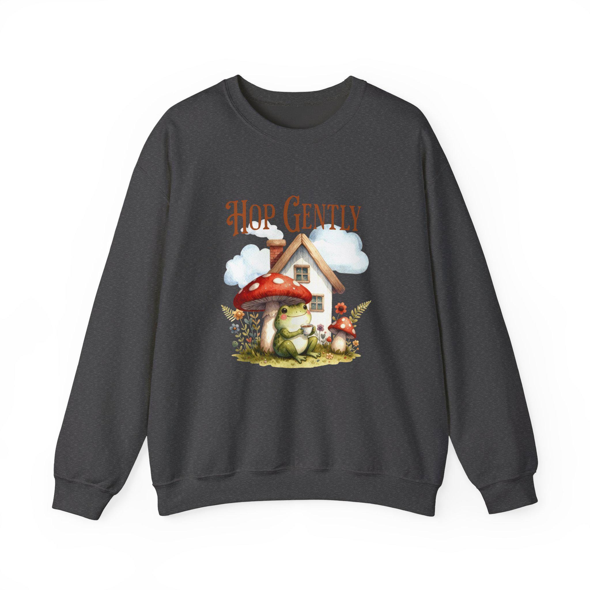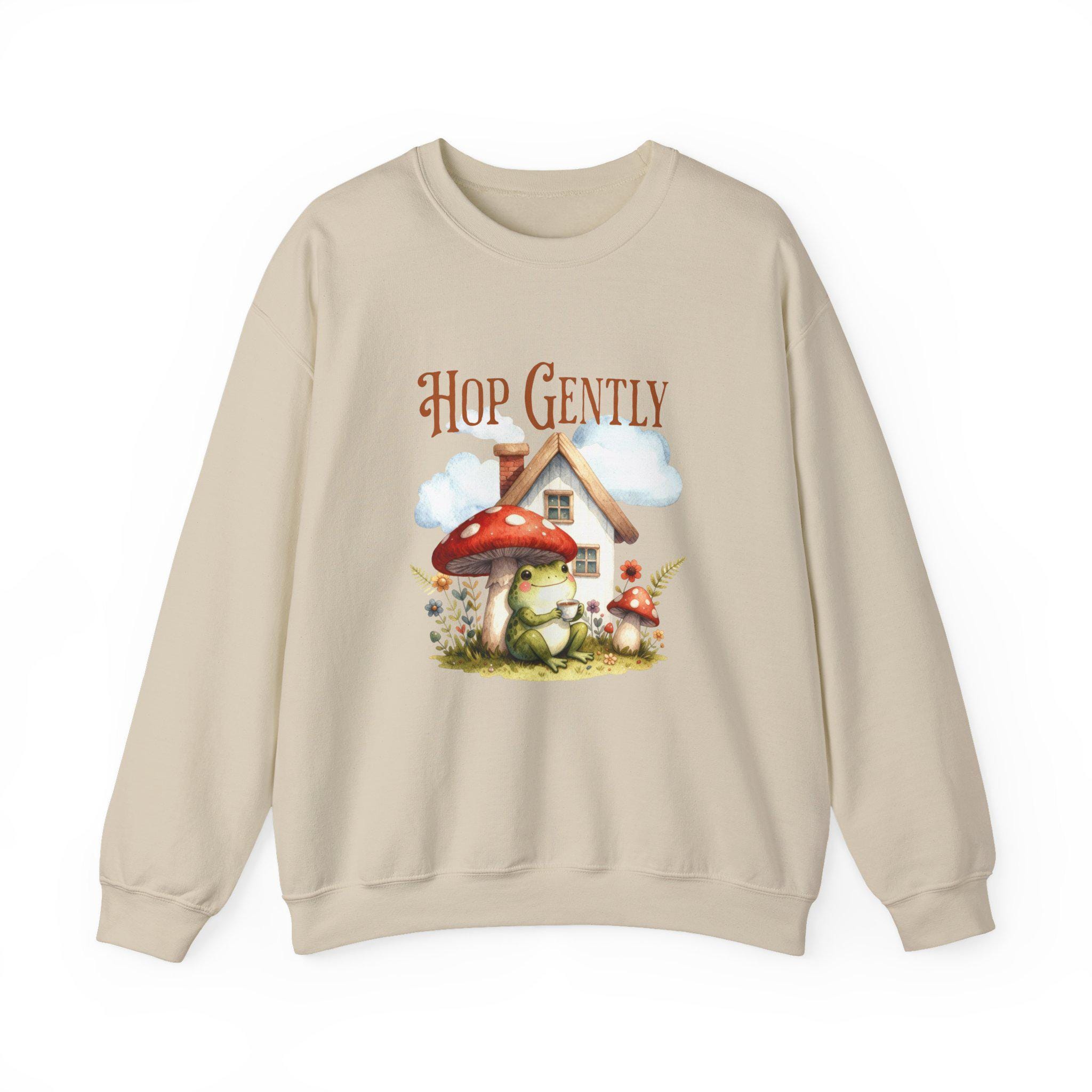 A cozy unisex sweatshirt featuring a cute cottagecore frog sipping tea under a red toadstool, with fern leaves and a warm pastel palette. The design exudes a soft and whimsical vibe, perfect for those who enjoy slower walks in the woods. Ideal for adults looking for comfort and durability in their wardrobe. Relevant for holidays like Christmas, birthdays, and any nature-themed celebrations.