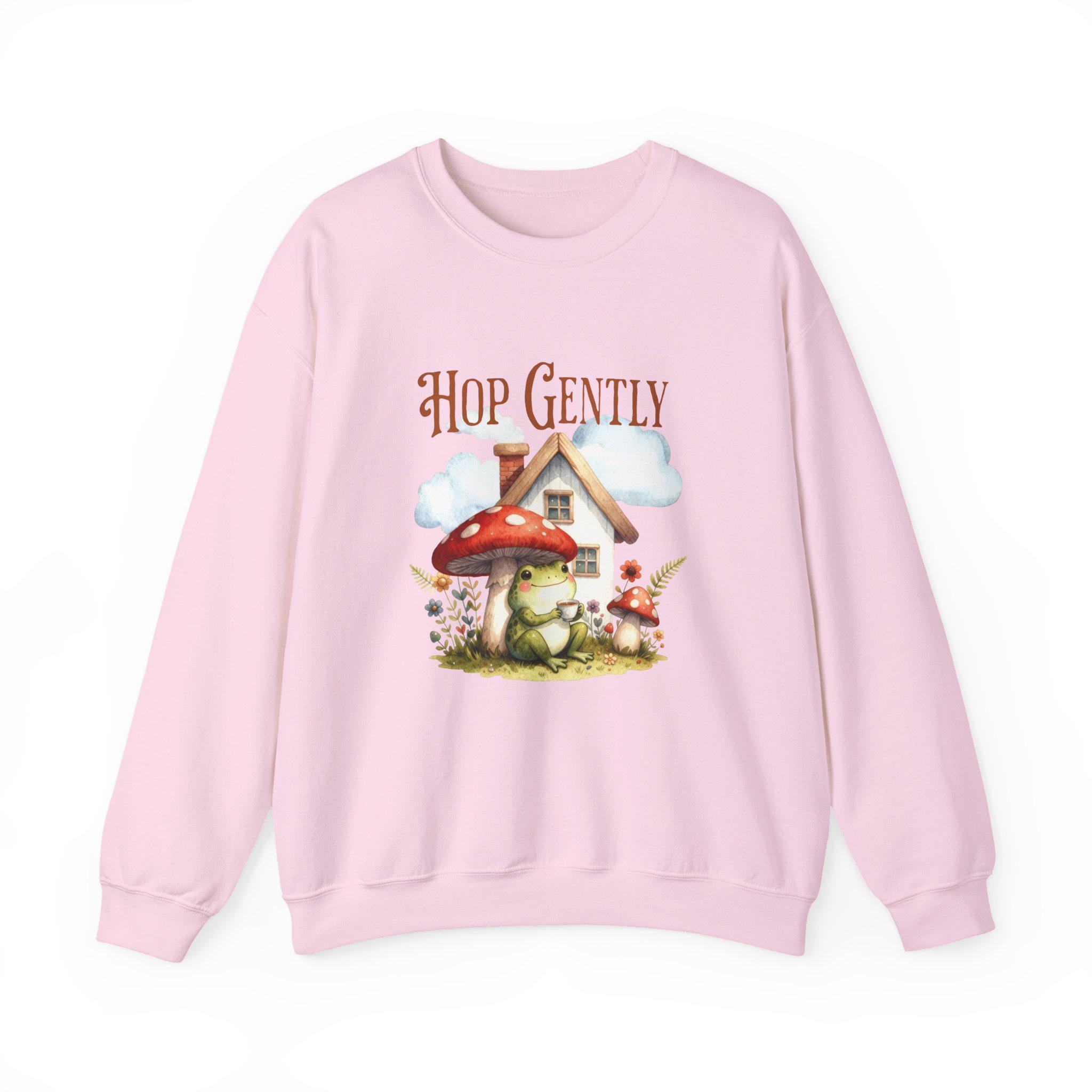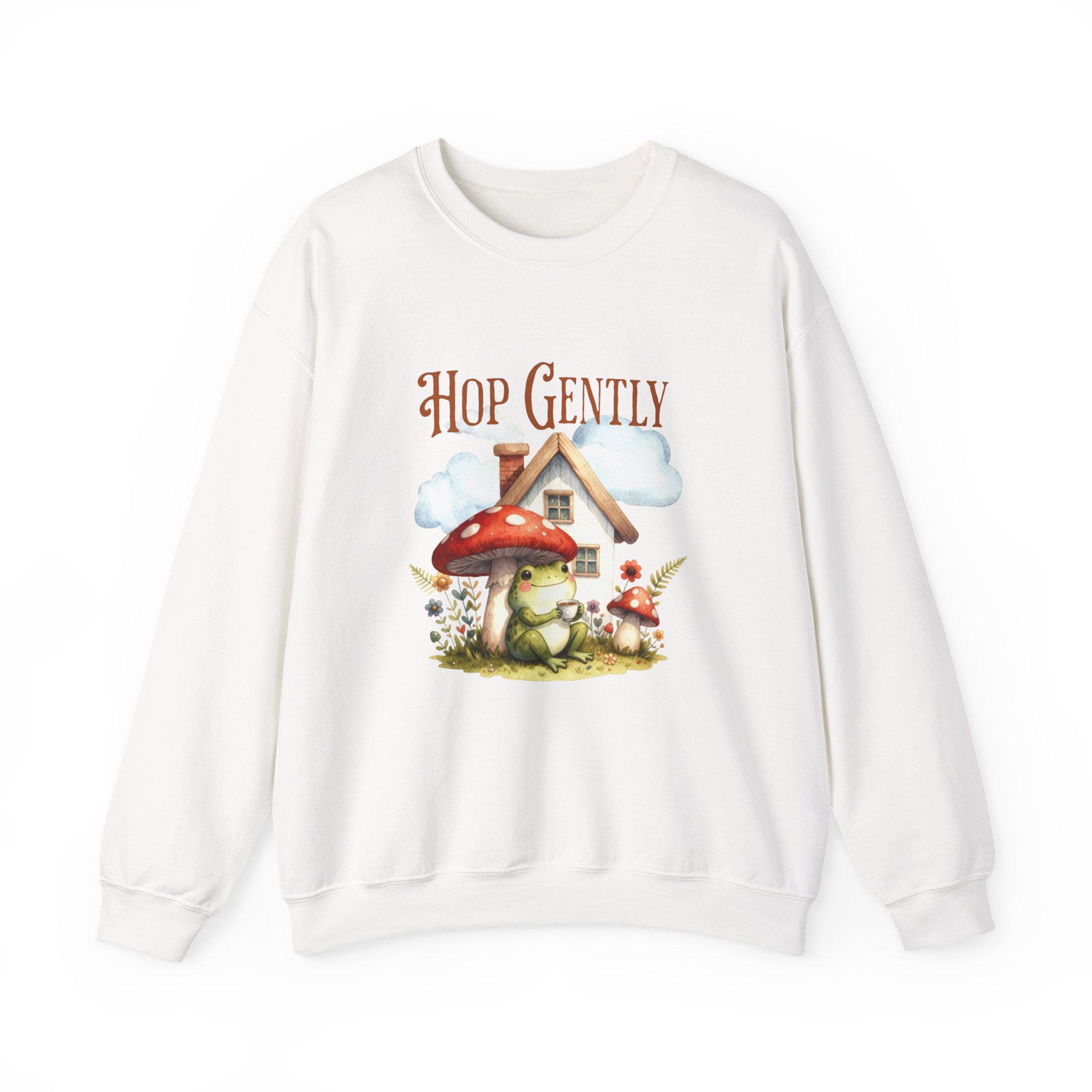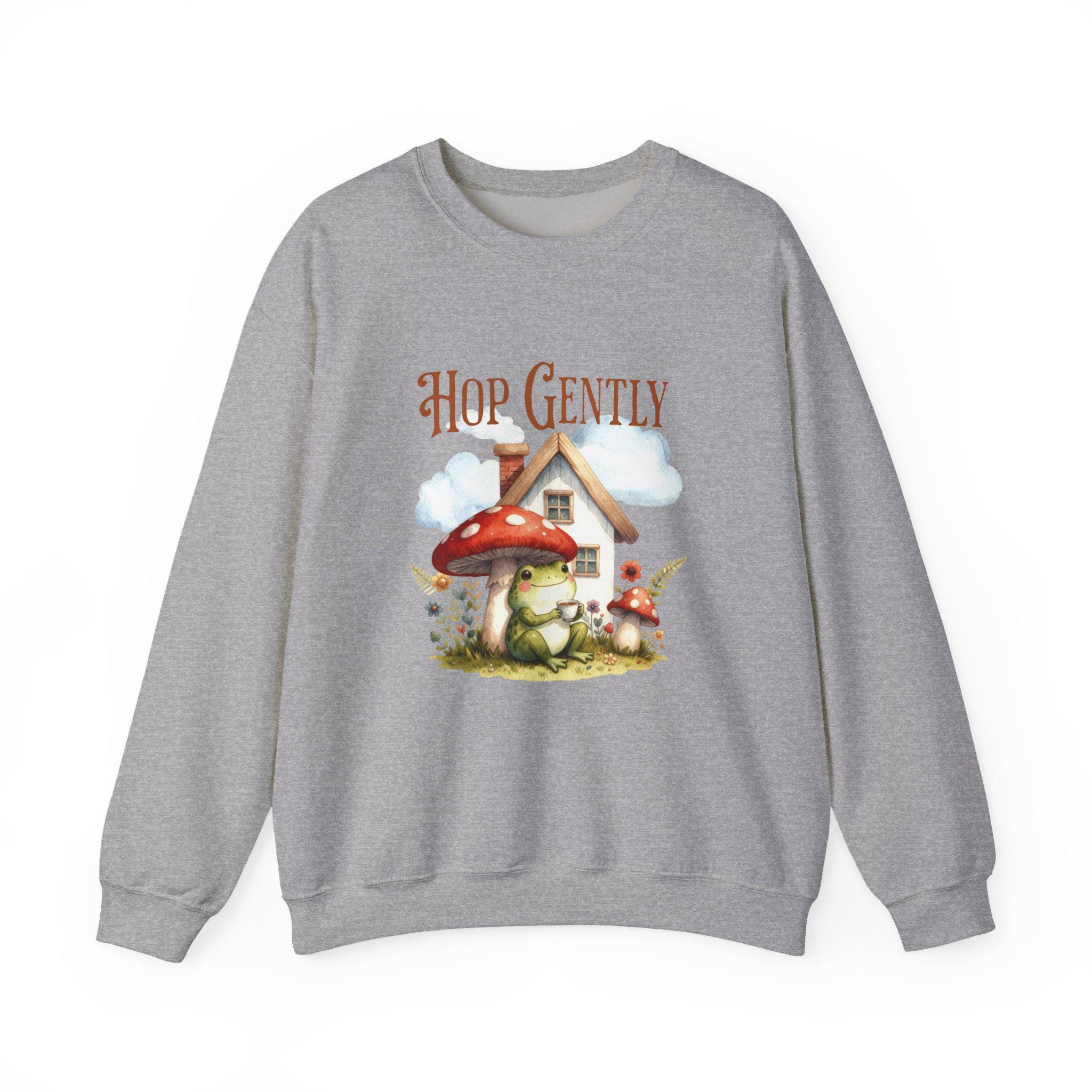 A cozy unisex sweatshirt featuring a cute cottagecore frog sipping tea under a red toadstool, with fern leaves and a warm pastel palette. The design exudes a soft and whimsical vibe, perfect for those who enjoy slower walks in the woods. Ideal for adults looking for comfort and durability in their wardrobe. Relevant for holidays like Christmas, birthdays, and any nature-themed celebrations.