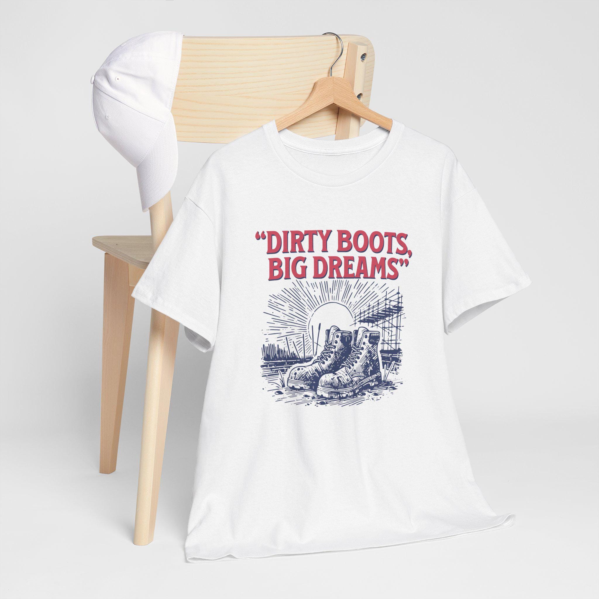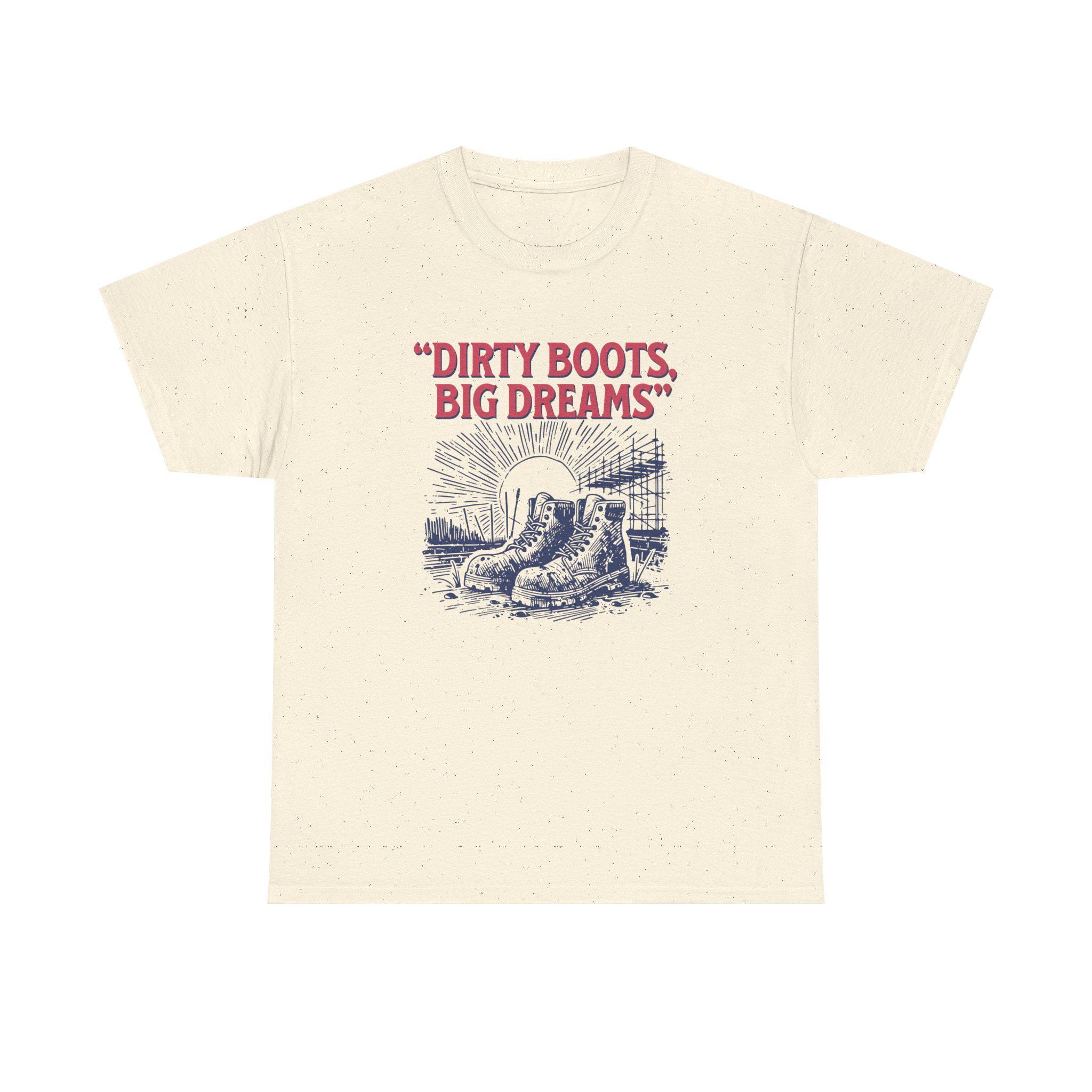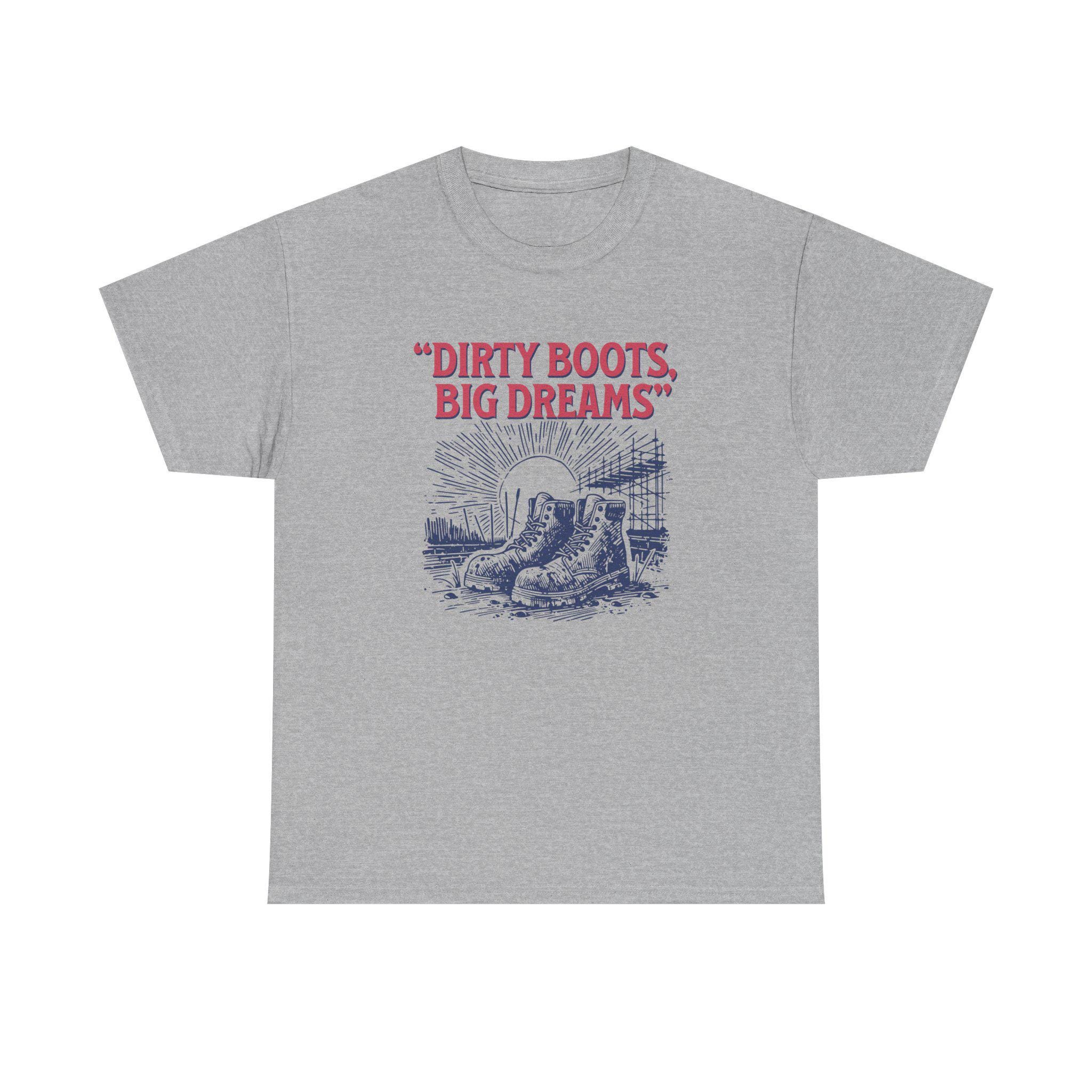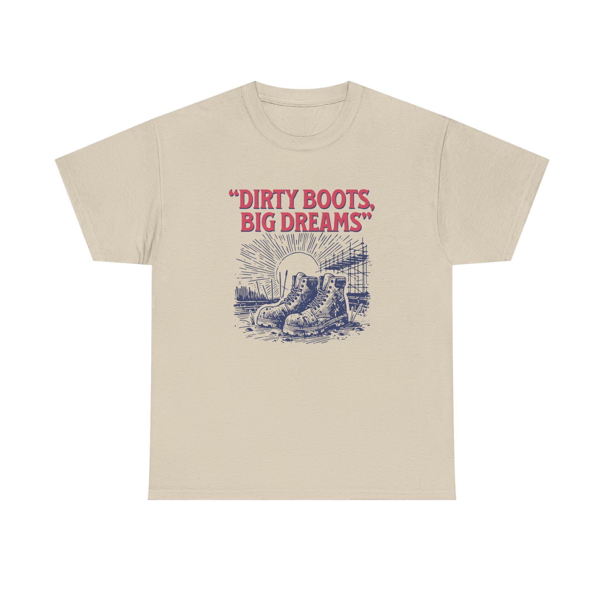 Built for the doers. This “Dirty Boots, Big Dreams” graphic celebrates blue-collar pride—perfect for job-site grinders, weekend warriors, and anyone raising calloused hands toward big goals. Hand-drawn work boots with sunrise and scaffolding give it a classic, rugged look that pairs with jeans, flannels, and hard work.