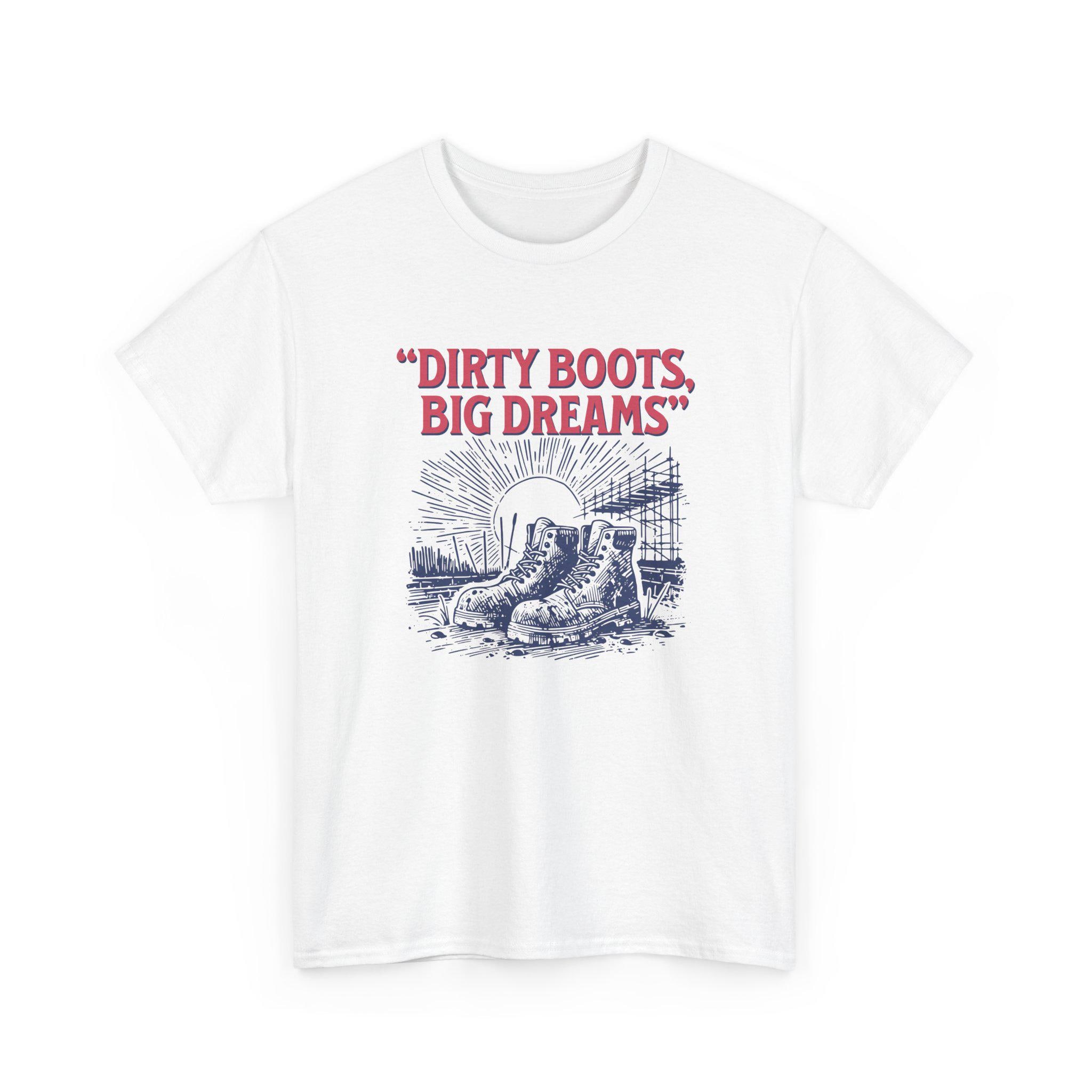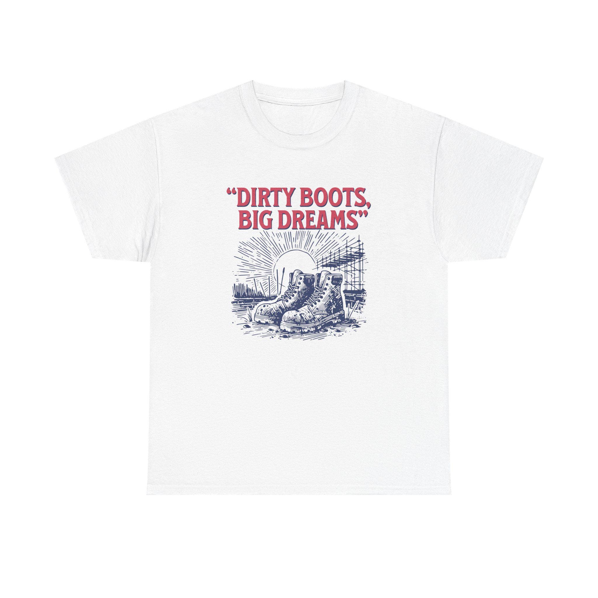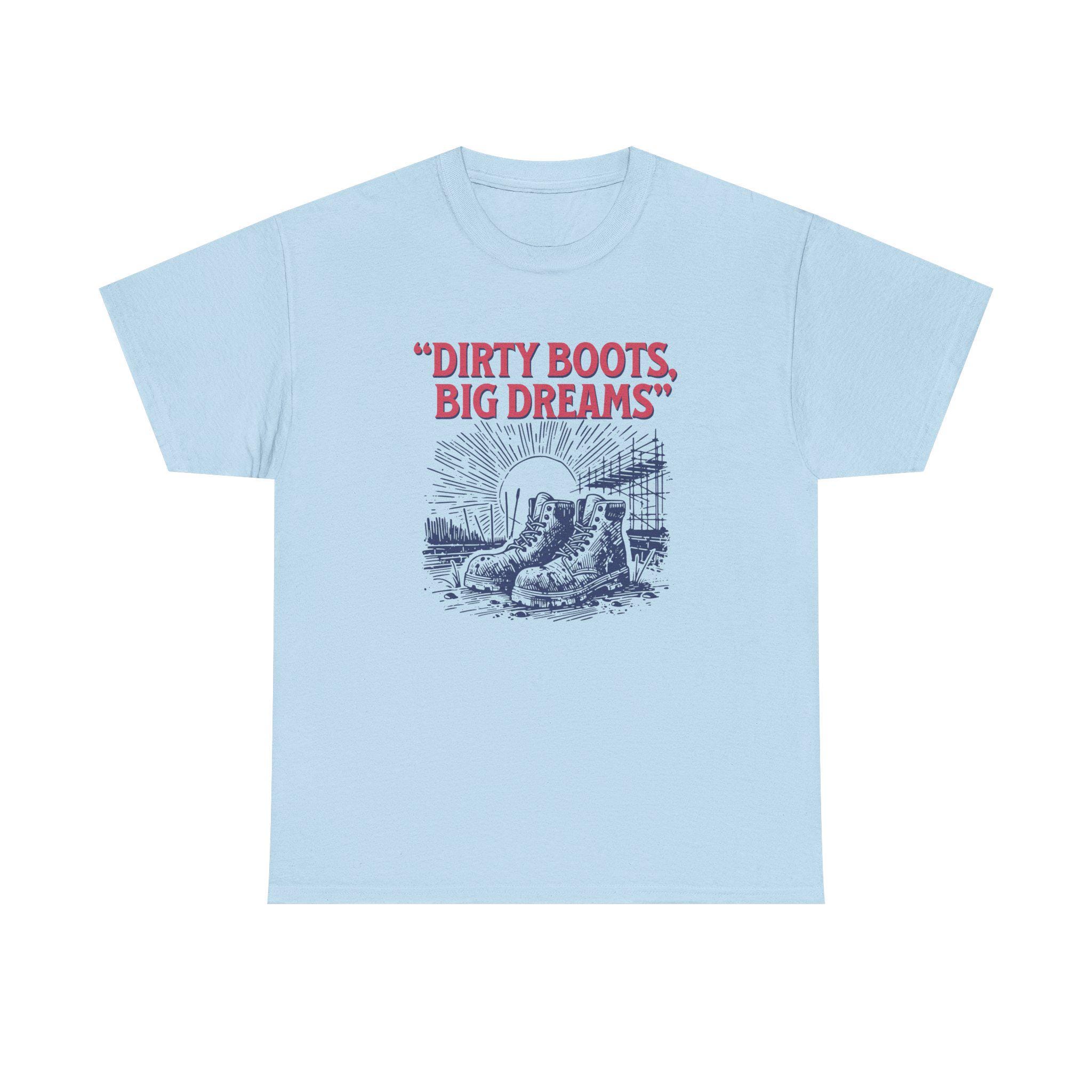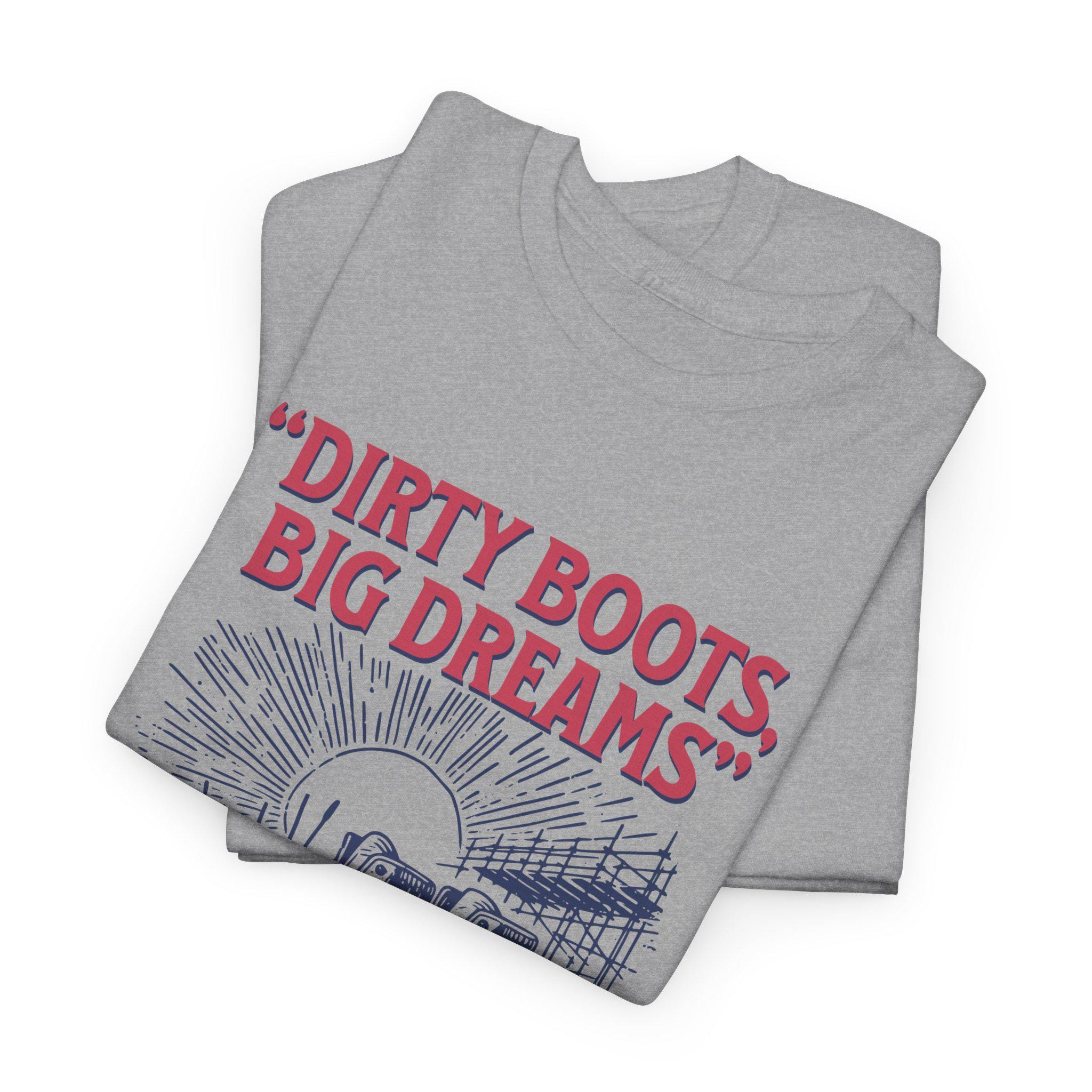 Built for the doers. This “Dirty Boots, Big Dreams” graphic celebrates blue-collar pride—perfect for job-site grinders, weekend warriors, and anyone raising calloused hands toward big goals. Hand-drawn work boots with sunrise and scaffolding give it a classic, rugged look that pairs with jeans, flannels, and hard work.