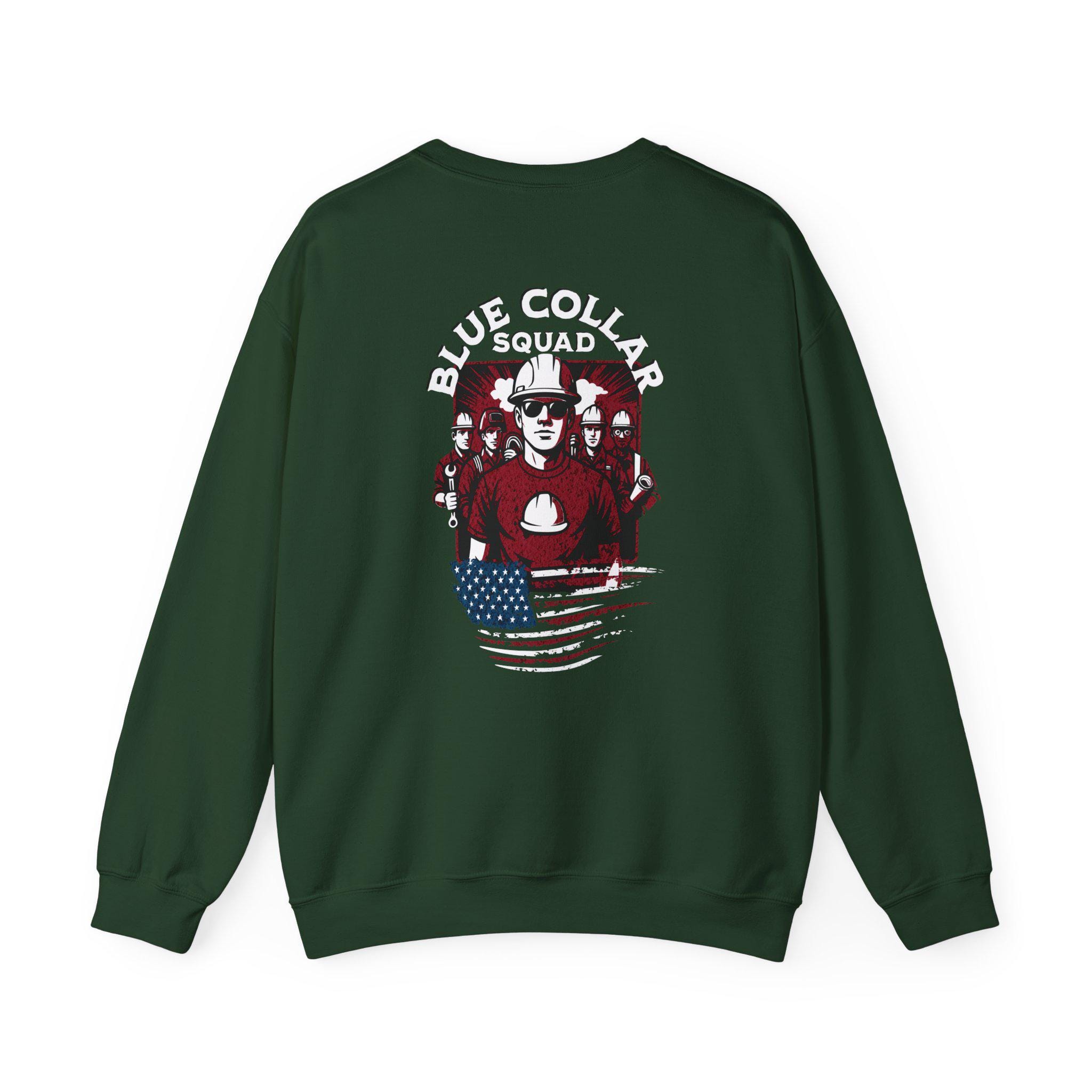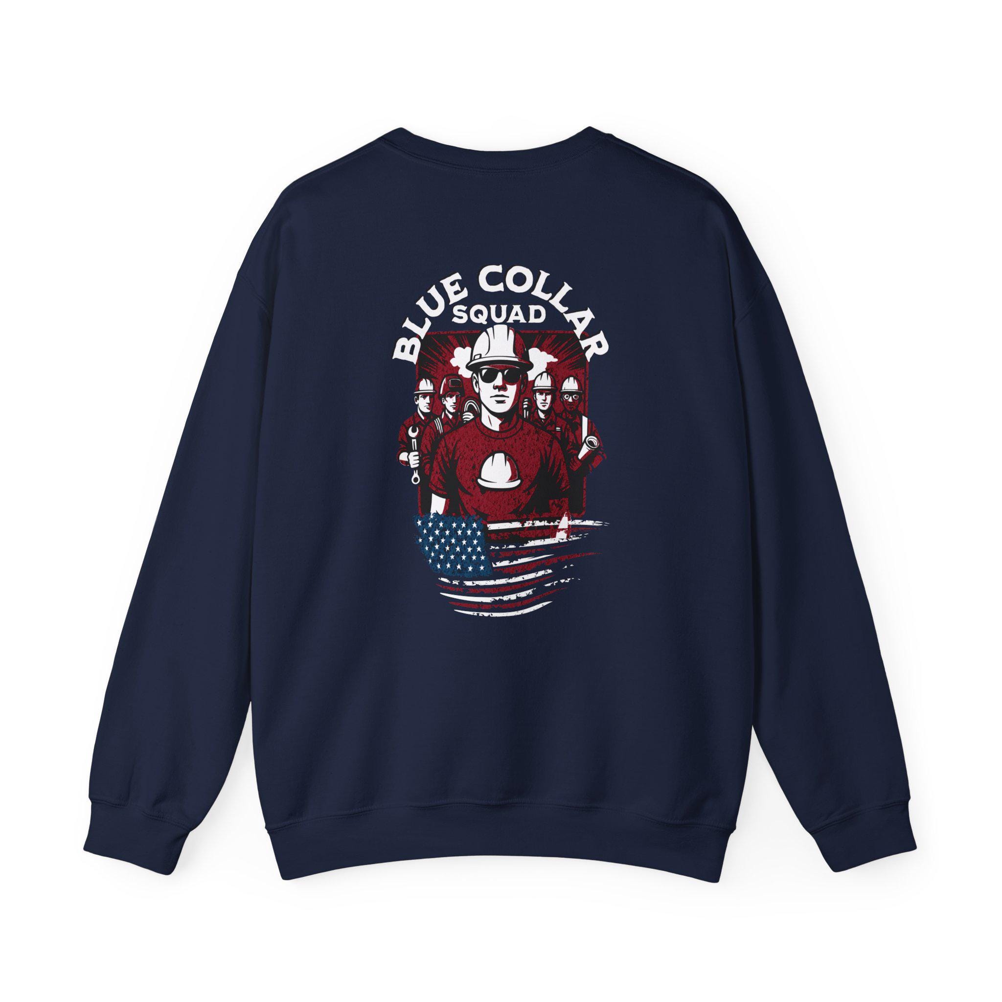 Stand proud with this Blue Collar Squad patriotic work shirt. The design features a hardhat-wearing crew front and center with a distressed American flag across the bottom—perfect for the men and women who actually keep the country running.