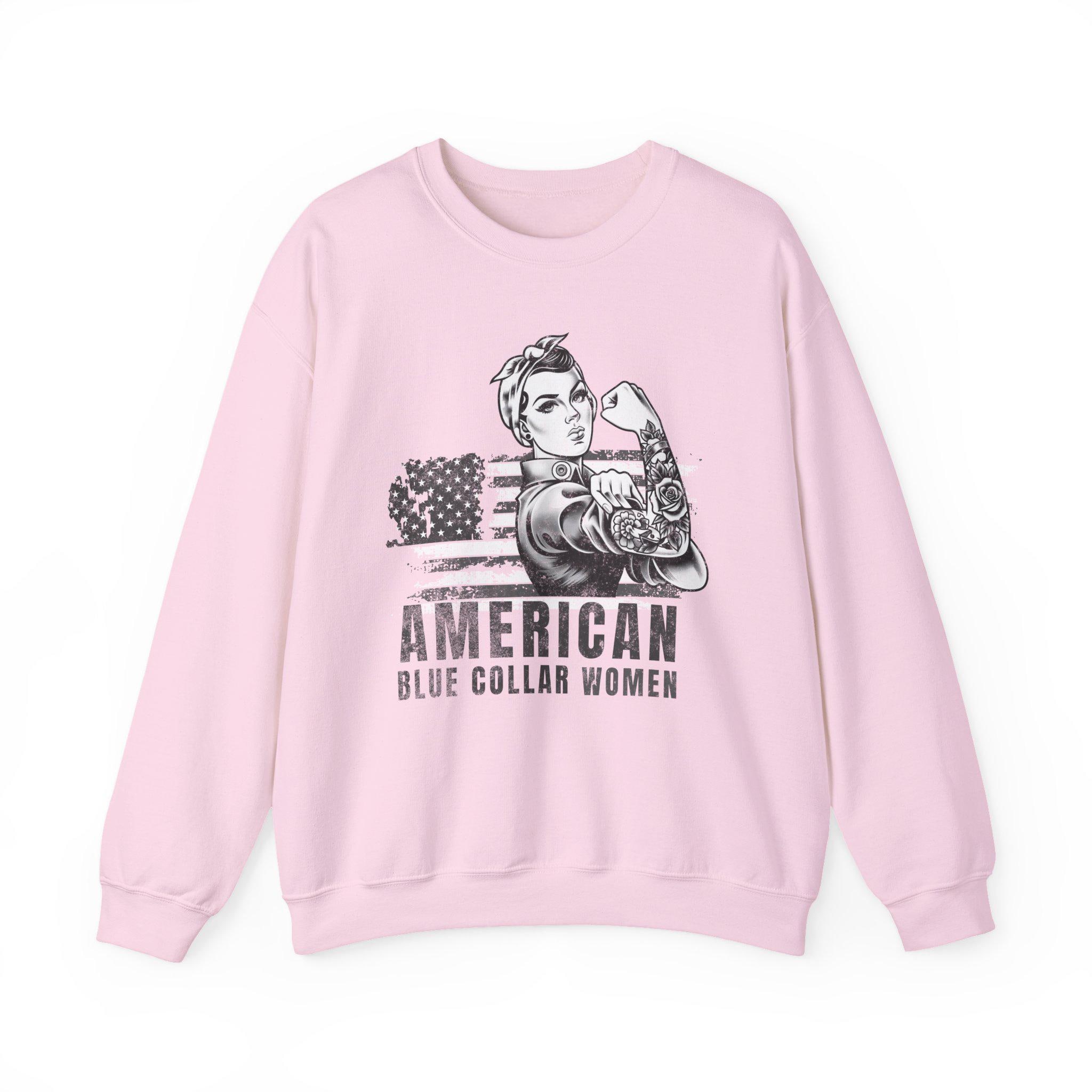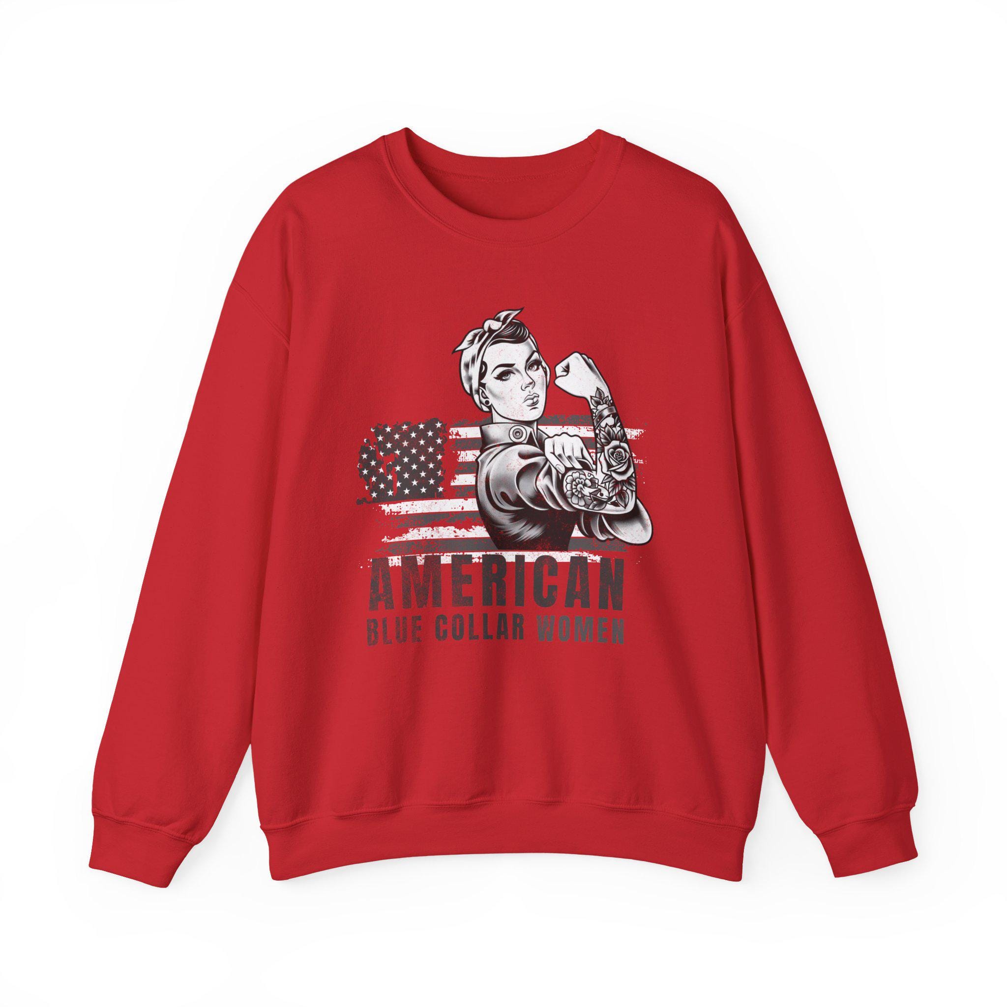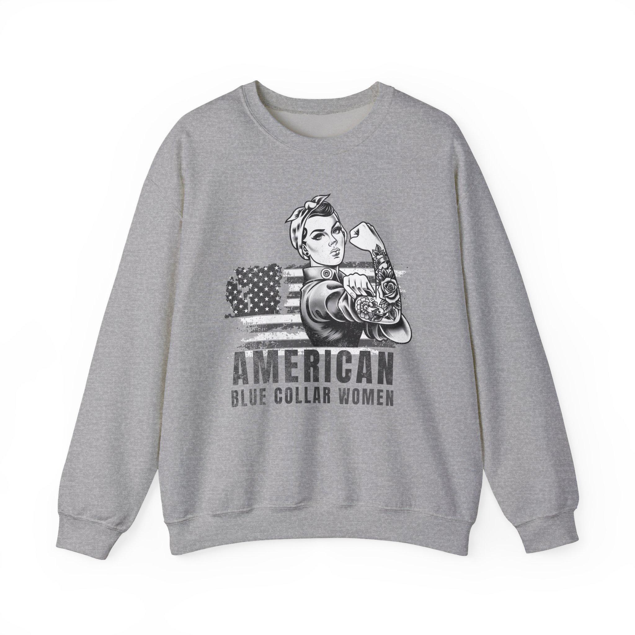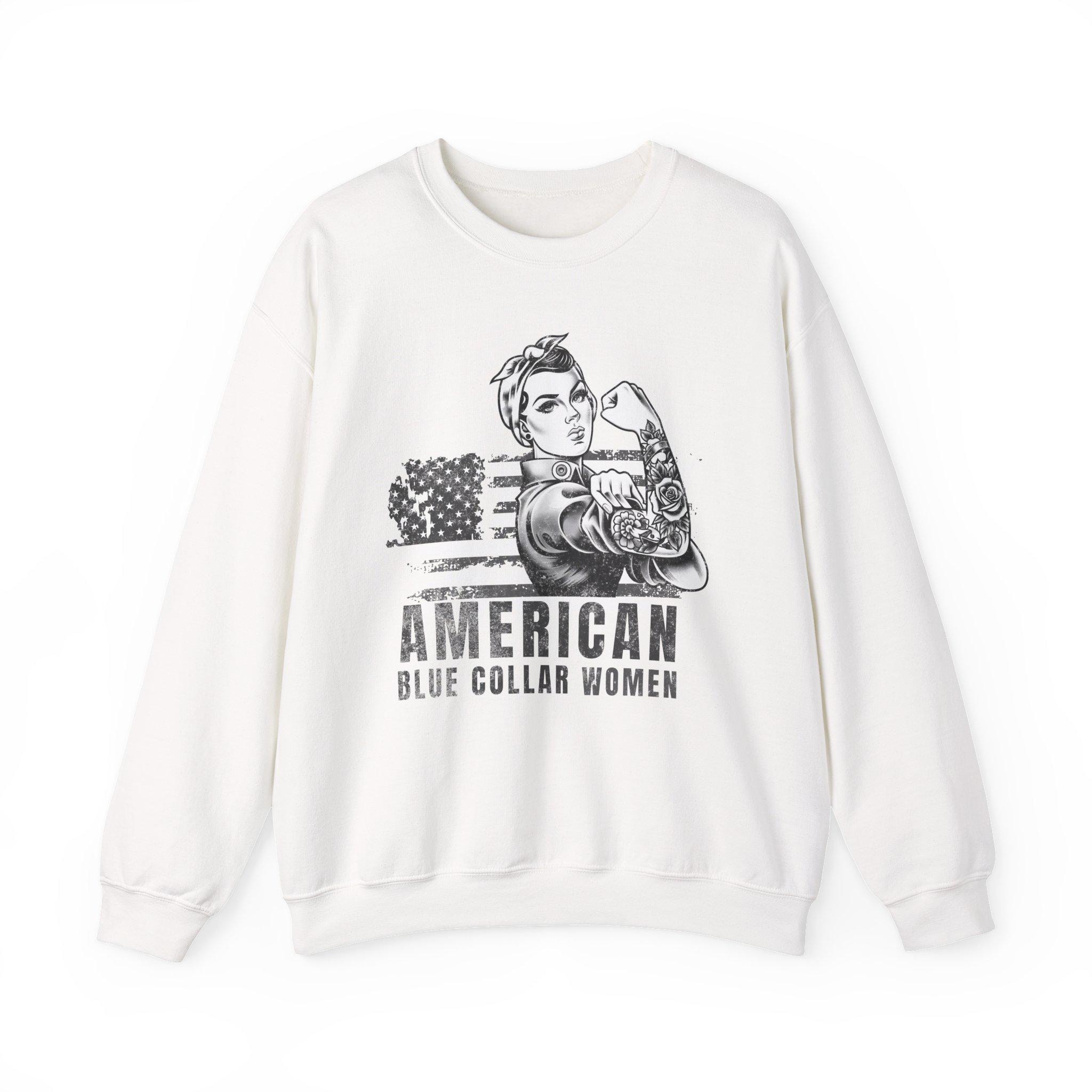 This vintage-inspired crew sweatshirt carries a quiet, proud energy — made for women who build, fix, and show up. The front features a strong Rosie-like figure rolling up her sleeve next to a distressed American flag and the words “AMERICAN / BLUE COLLAR WOMEN.” It wears like a well-loved layer: medium-heavy 50/50 cotton-poly knit with a classic crew neckline, ribbed cuffs and hem, and durable double-needle stitching. The soft tear-away label keeps the neck itch-free, and responsible materials (ethically grown US cotton, OEKO-TEX dyes) mean you can feel good about wearing it. It’s roomy enough for a mid-shift layer and clean enough to pair with a jacket when you head out after work.