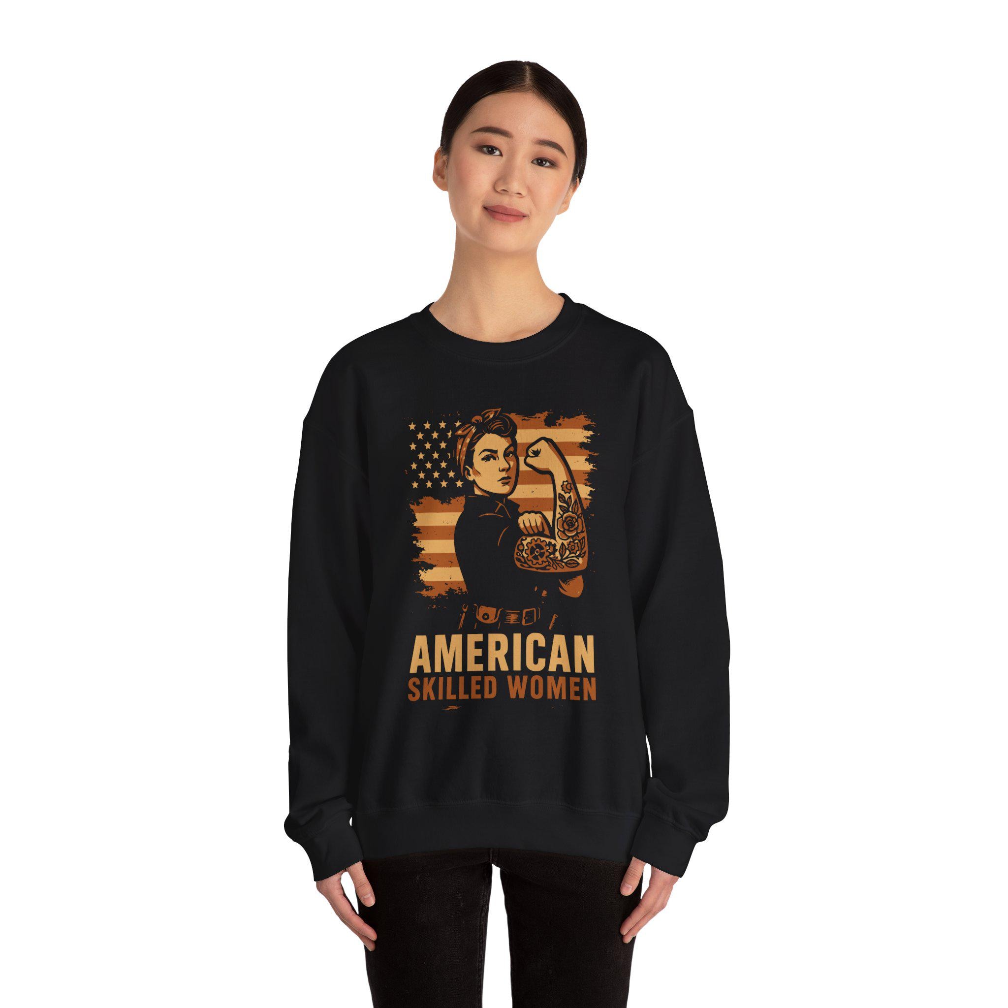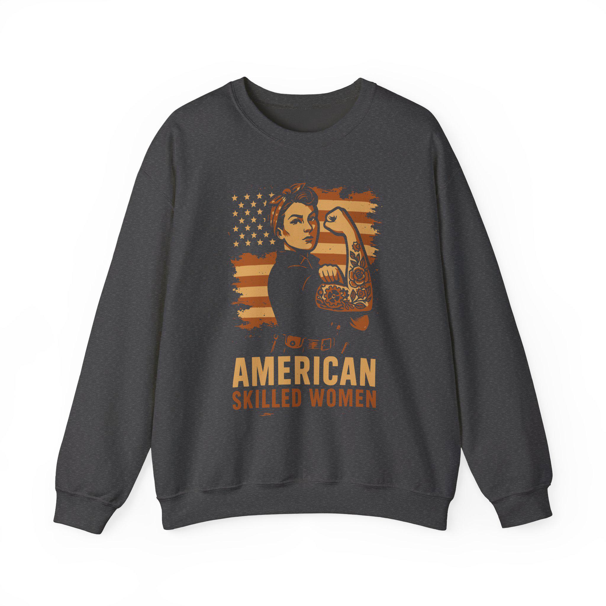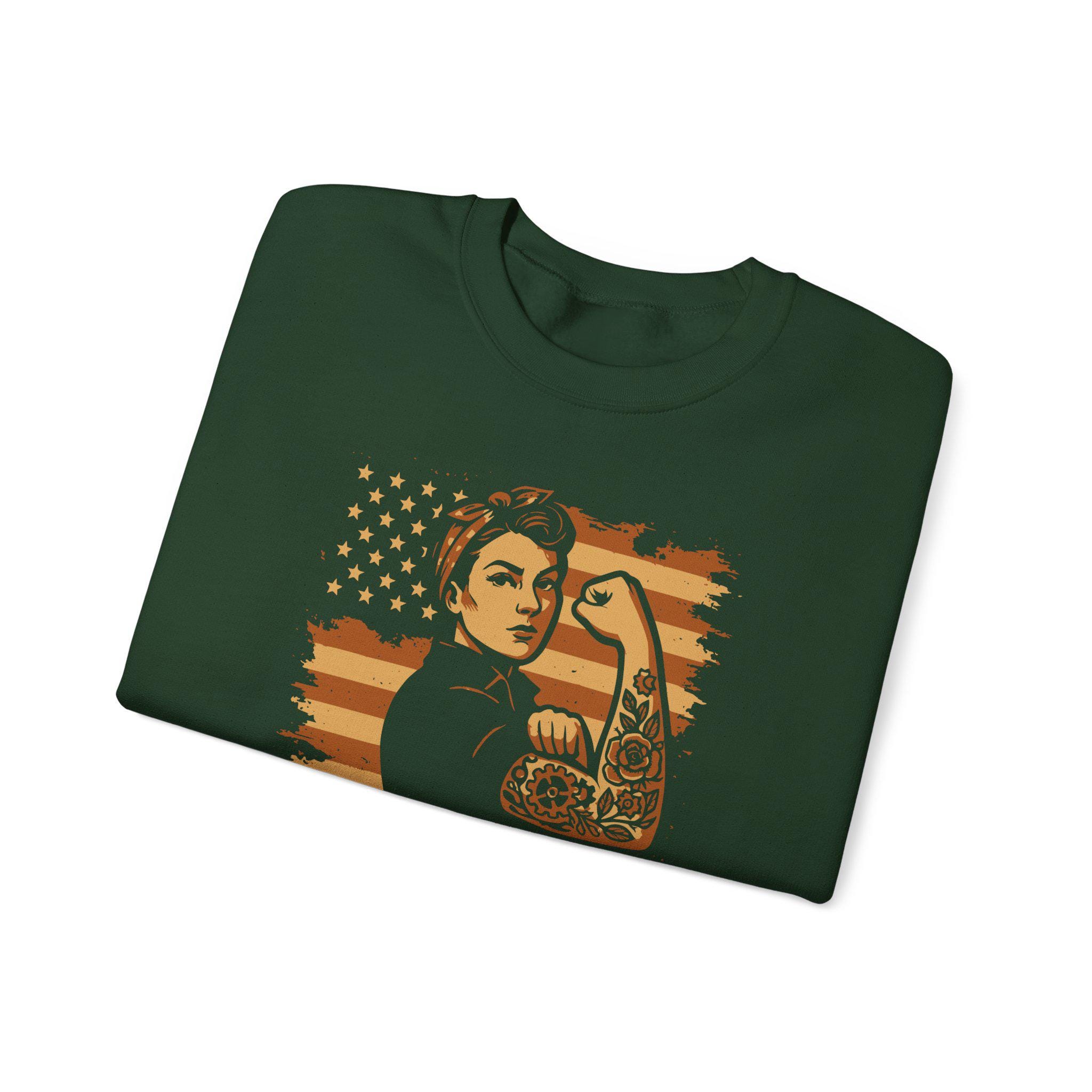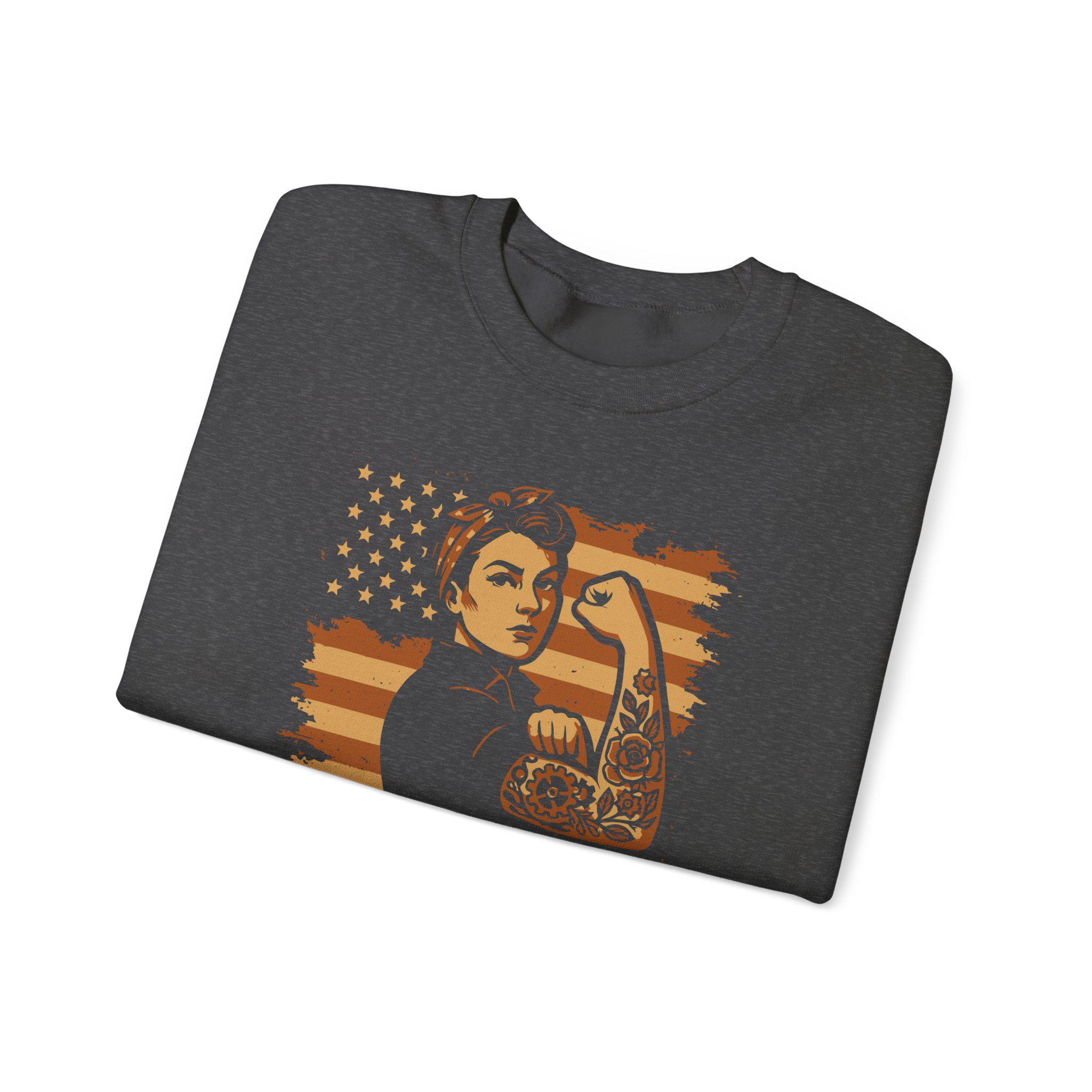 This crewneck sweatshirt carries calm confidence — a vintage-inspired graphic of a strong woman set against a weathered American flag. The muted sepia tones and bold lettering read as steady and sincere, not flashy. Slip it on for chilly mornings at the workshop, coffee runs, or long drives between job sites. The weight and structure keep shape while soft cotton-poly comfort lets you move freely. It feels worn-in from the first wear, the kind of layer you reach for when you want your clothes to say quietly that you know your craft.