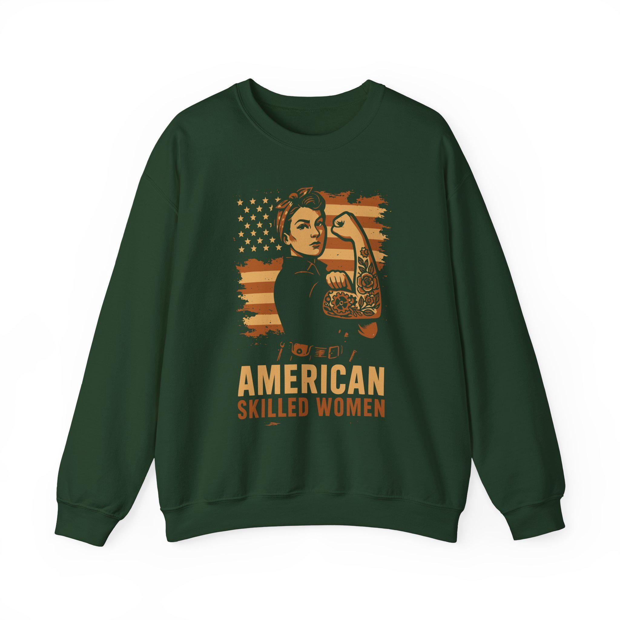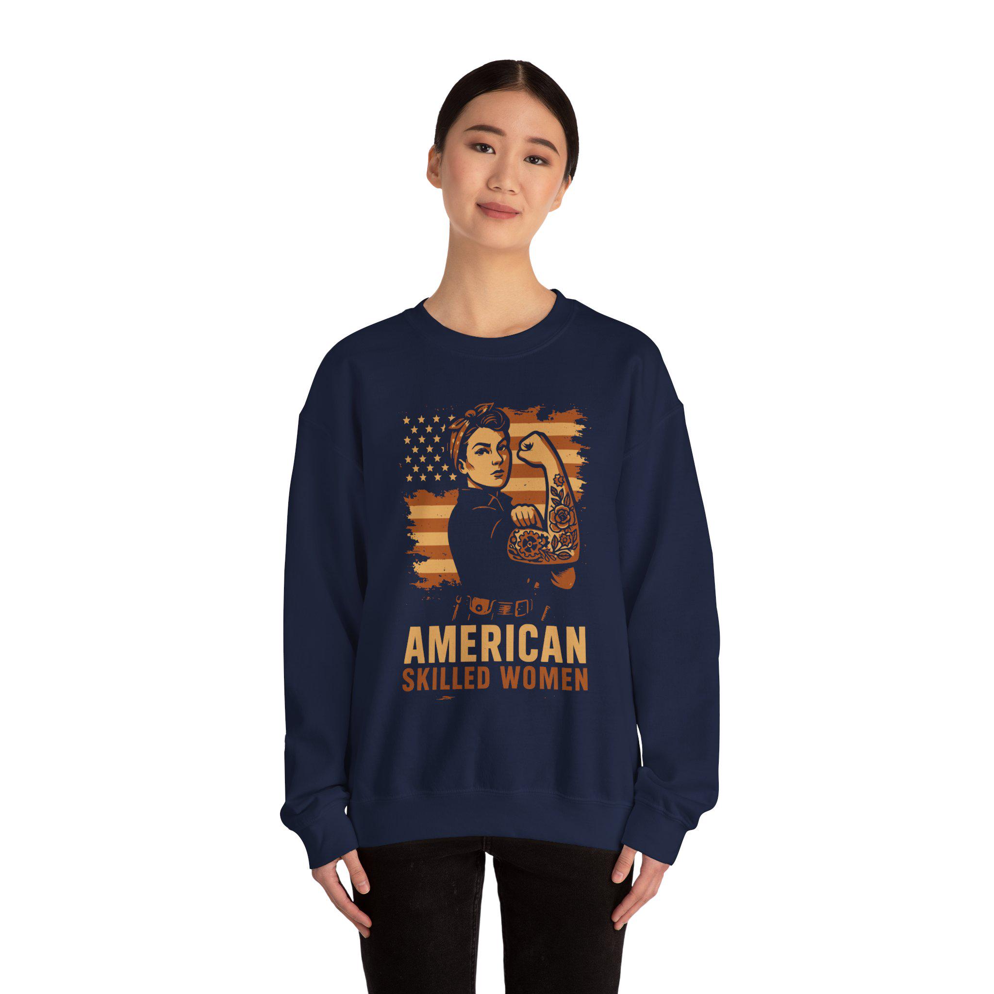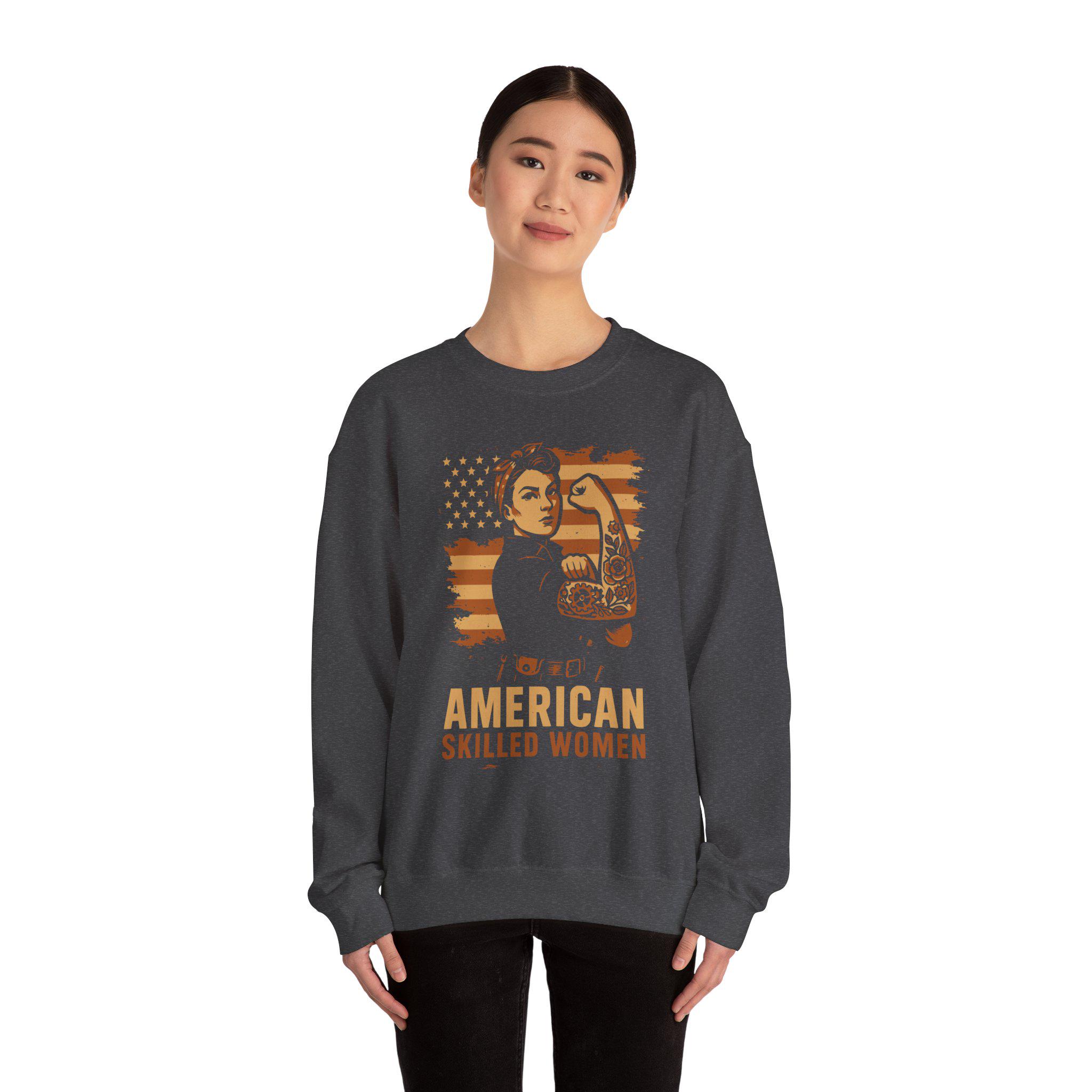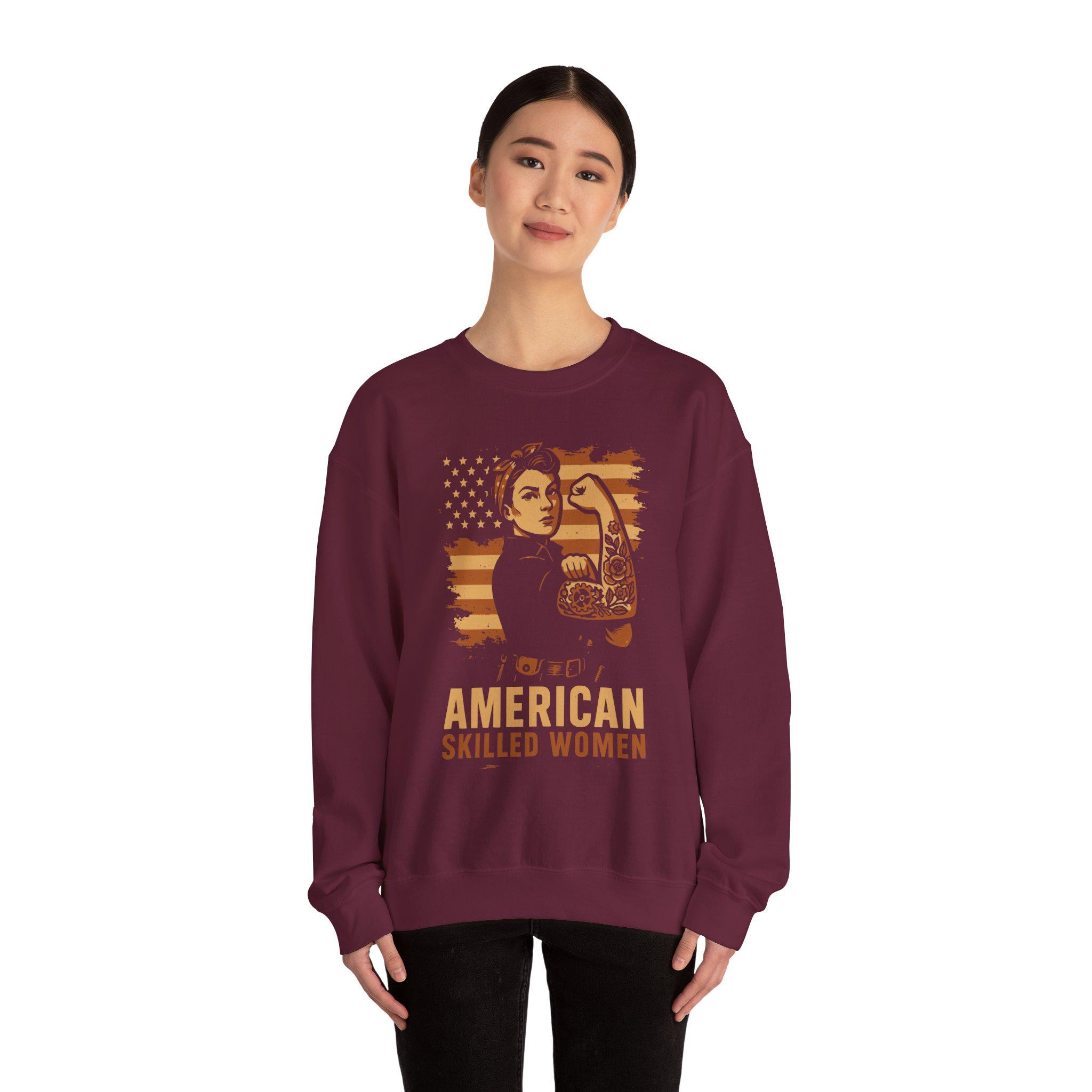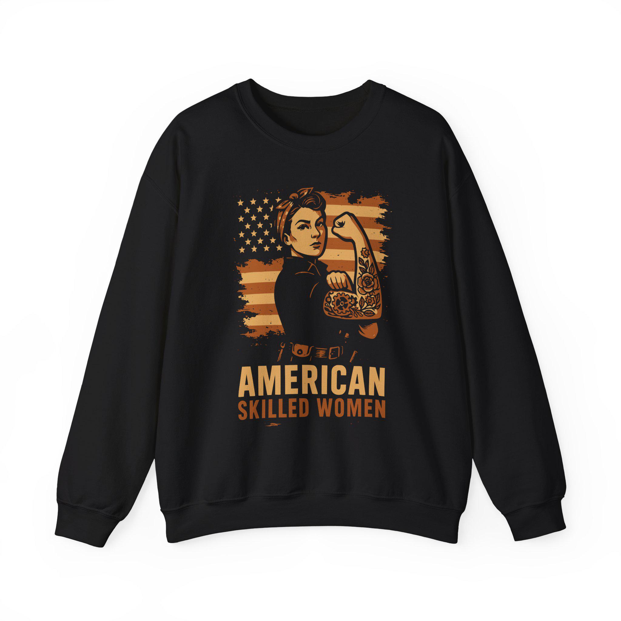 This crewneck sweatshirt carries calm confidence — a vintage-inspired graphic of a strong woman set against a weathered American flag. The muted sepia tones and bold lettering read as steady and sincere, not flashy. Slip it on for chilly mornings at the workshop, coffee runs, or long drives between job sites. The weight and structure keep shape while soft cotton-poly comfort lets you move freely. It feels worn-in from the first wear, the kind of layer you reach for when you want your clothes to say quietly that you know your craft.