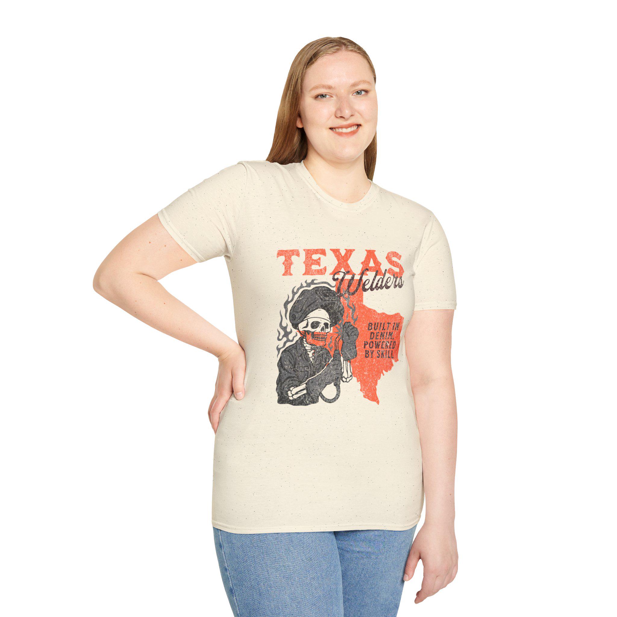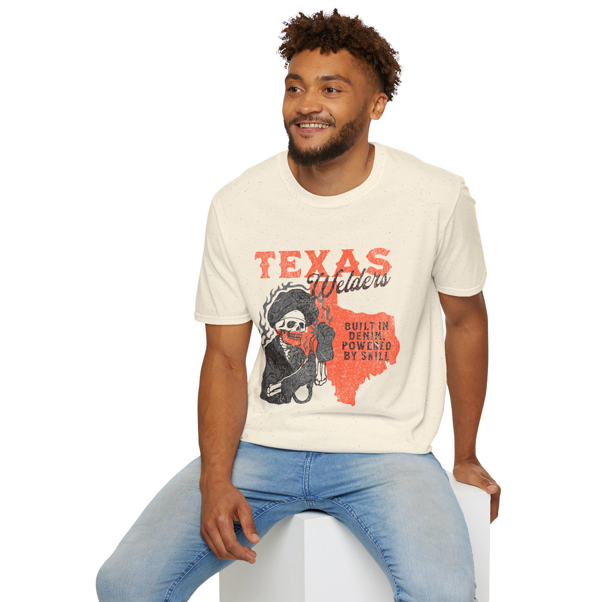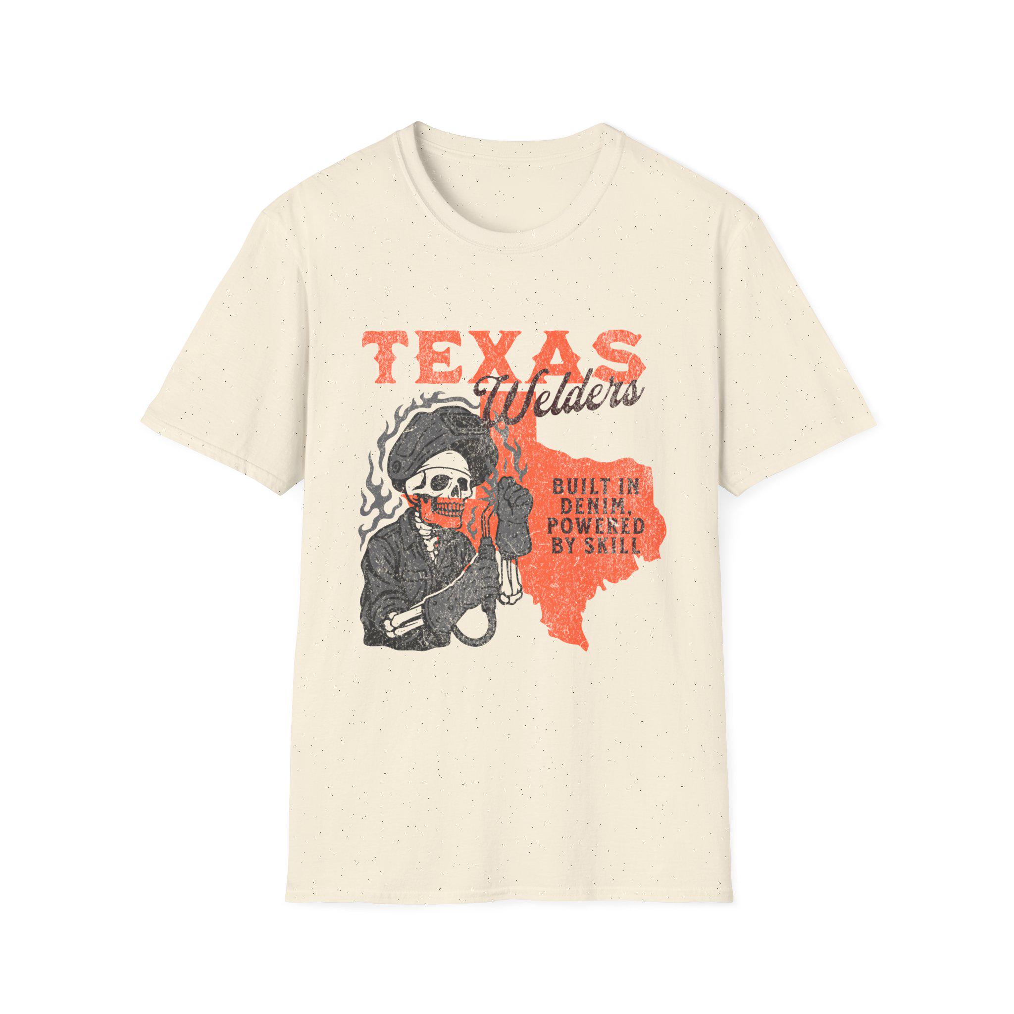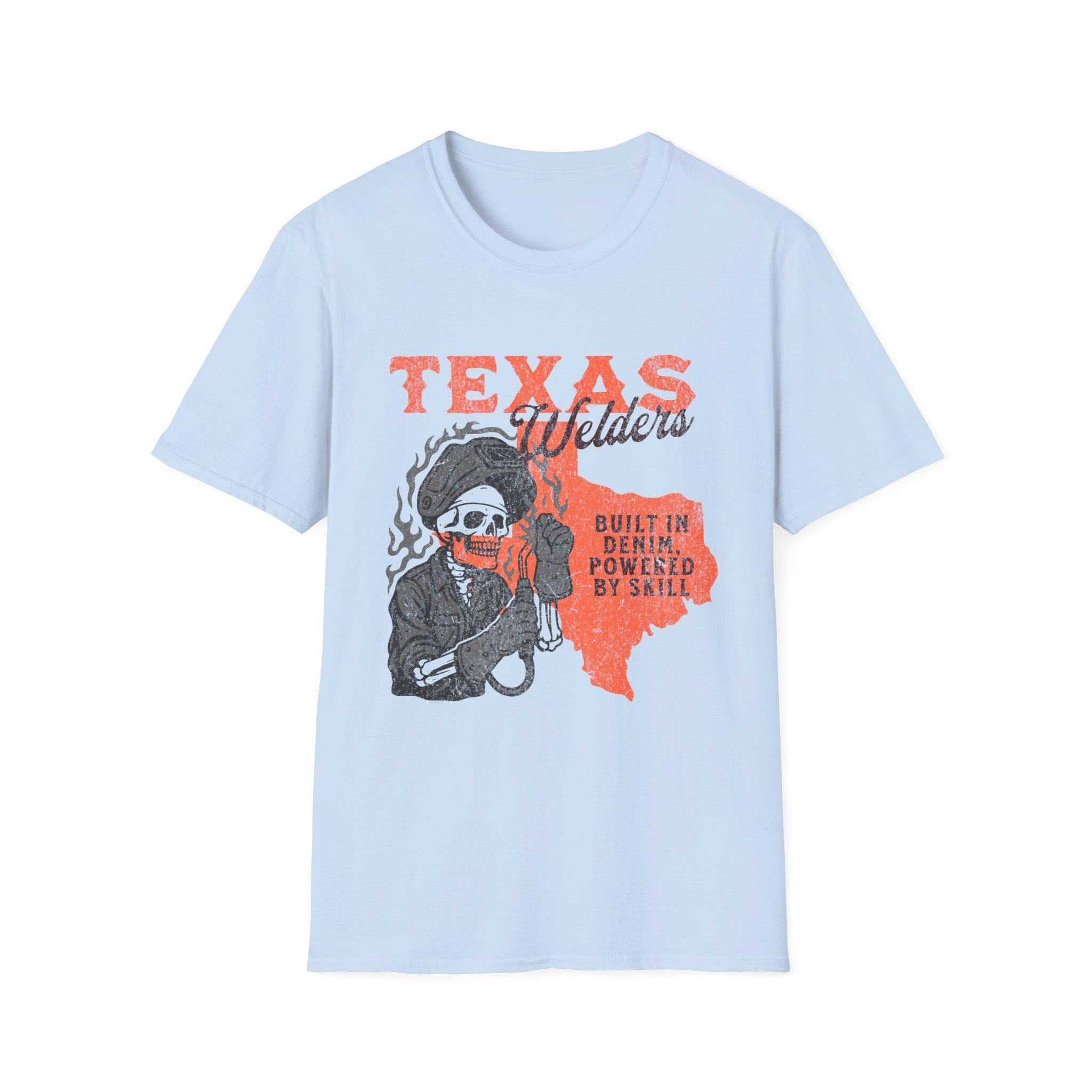 This lightweight cotton tee brings a rough-edged Texas welding vibe to everyday wear. The front shows a gritty, vintage-style welder skull layered over a distressed Texas silhouette and bold type — a look that reads like a weathered shop poster. It sits soft and breathable on the skin, drapes in a classic crew-neck silhouette, and wears well under a flannel or alone on hot job sites and weekends alike. Built to hold prints cleanly and resist stretching, the shirt keeps that lived-in look while staying comfortable through long days in the workshop or casual nights out.